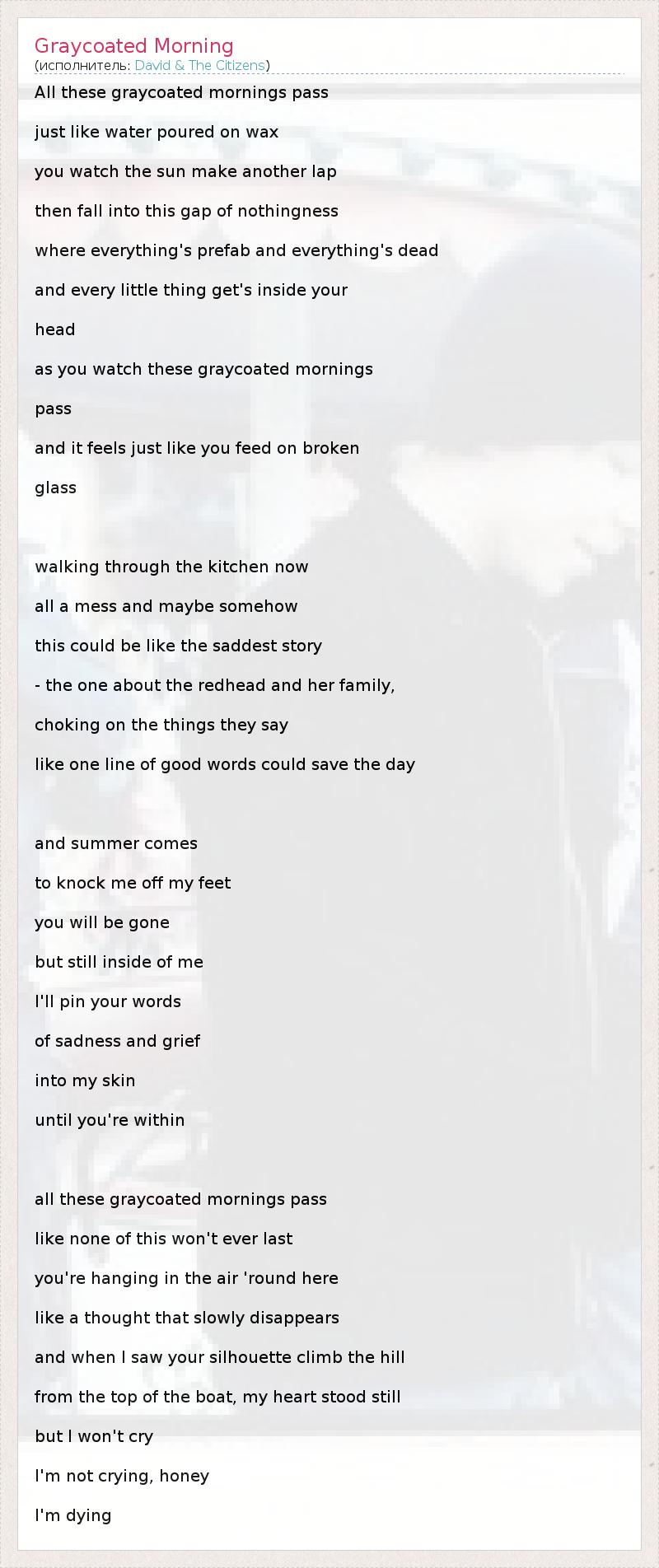 All these graycoated mornings pass just like water poured on wax you watch the sun make another lap then fall into this gap of nothingness where everything's prefab and everything's dead and every little thing get's inside your head as you watch these graycoated mornings pass and it feels just like you feed on broken glass walking through the kitchen now all a mess and maybe somehow this could be like the saddest story - the one about the redhead and her family, choking on the things they say like one line of good words could save the day and summer comes to knock me off my feet you will be gone but still inside of me I'll pin your words of sadness and grief into my skin until you're within all these graycoated mornings pass like none of this won't ever last you're hanging in the air 'round here like a thought that slowly disappears and when I saw your silhouette climb the hill from the top of the boat, my heart stood still but I won't cry I'm not crying, honey I'm dying