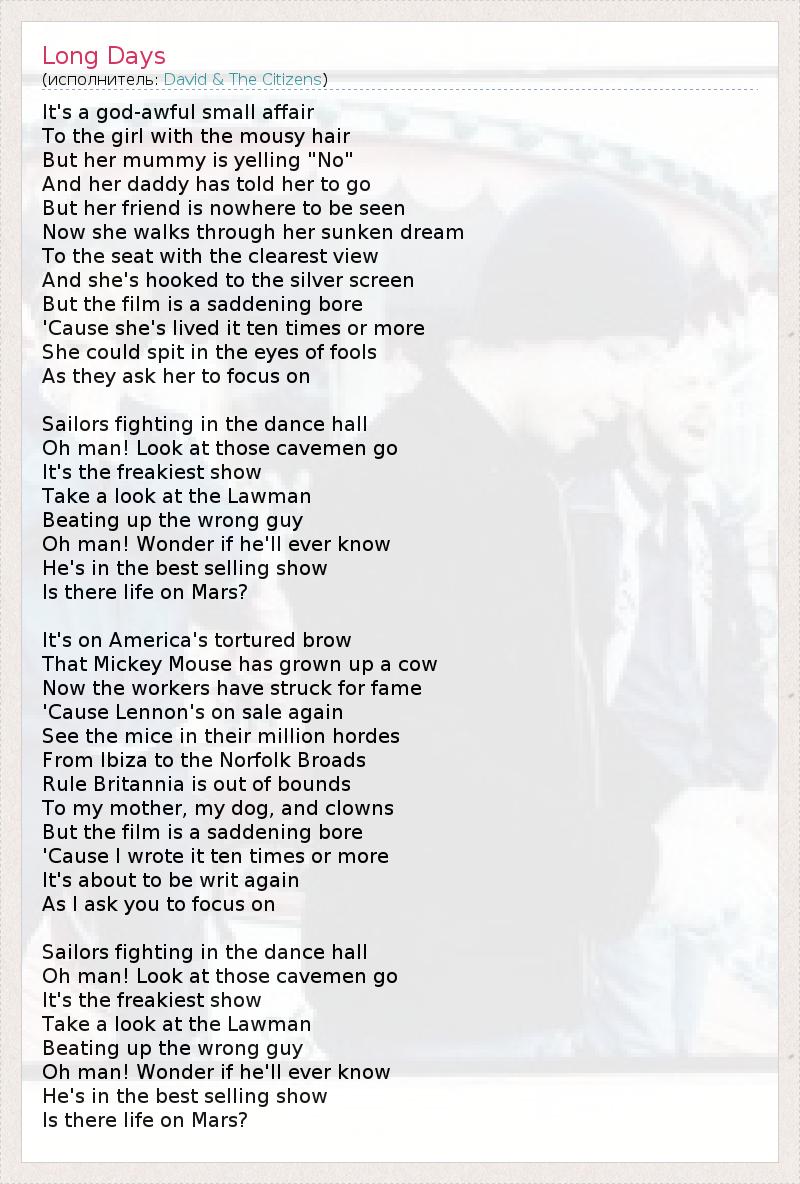 Это чертовски маленькое дельце Для девушки с волосами мышиного цвета. Но ее мамочка вопит: “Нет!”. И ее папочка сказал ей уйти, Но ей не к кому пойти. Теперь она бредет через затонувшие мечты К месту с девственным пейзажем. И она прикована к черно-белому экрану, Но фильм – унылая скука, Так как она смотрела его много раз. Она могла плюнуть в глаза дуракам, Поскольку те просили ее сосредоточиться. Моряки дерутся в танцевальном зале. О, человек! Взгляни на этих пещерных людей. Это наиуродливейшее зрелище. Взгляни на полицейского, Избивающего невиновного. О, человек! Будет удивительно, если он когда-нибудь узнает, Что является героем популярного шоу. Есть ли жизнь на Марсе? Именно на американской вымученной земле Тот Микки Маус вырастил корову. Теперь рабочие борются на славу, Поскольку Леннон стал снова популярен. Смотри, многочисленные орды мышей От Ибицы до Норфолк Броадс Властвуют за пределами Британии Над моей мамой, над моей собакой и клоунами. Но фильм – унылая скука. Поскольку я писал это много раз, То напишу это снова, Так как я прошу тебя сосредоточиться. Моряки дерутся в танцевальном зале. О, человек! Взгляни на этих пещерных людей. Это наиуродливейшее зрелище. Взгляни на полицейского, Избивающего невиновного. О, человек! Будет удивительно, если он когда-нибудь узнает, Что является героем популярного шоу. Есть ли жизнь на Марсе?