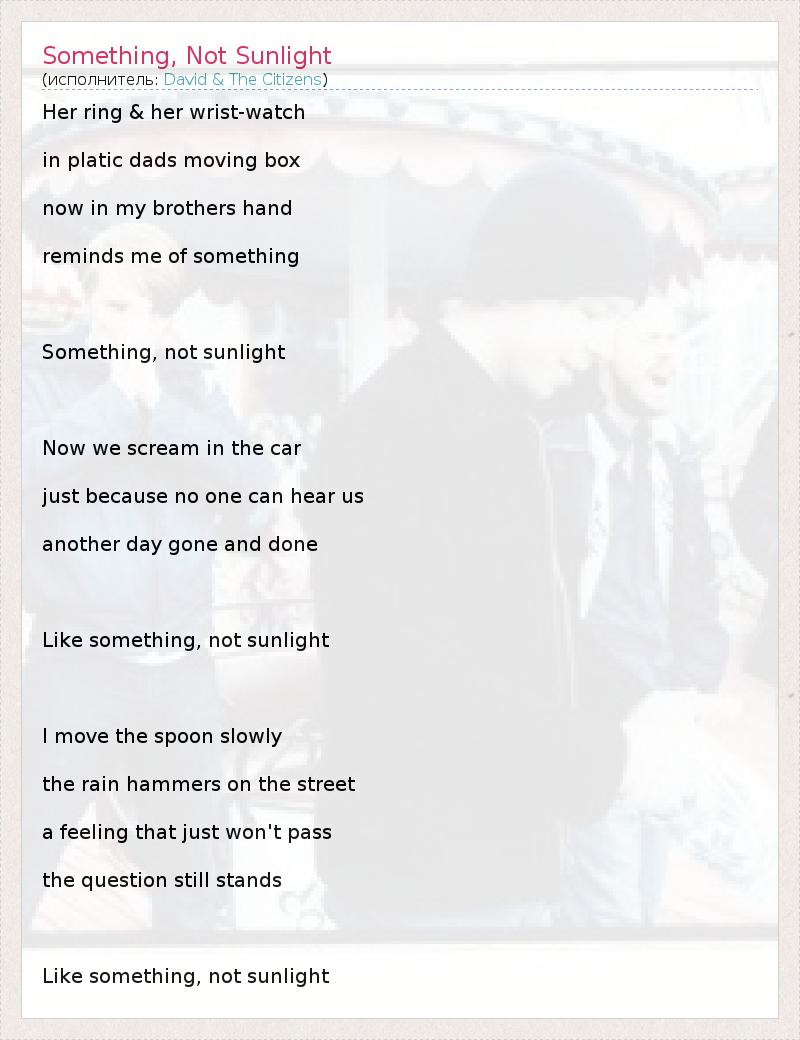 Her ring & her wrist-watch in platic dads moving box now in my brothers hand reminds me of something Something, not sunlight Now we scream in the car just because no one can hear us another day gone and done Like something, not sunlight I move the spoon slowly the rain hammers on the street a feeling that just won't pass the question still stands Like something, not sunlight