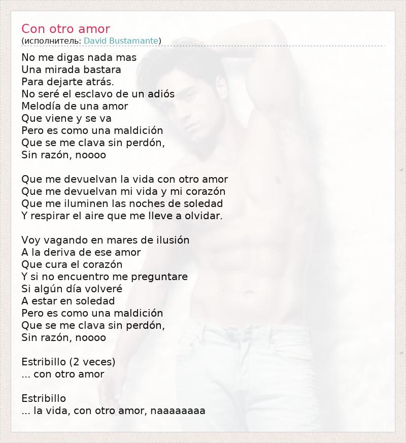 No me digas nada mas Una mirada bastara Para dejarte atrás. No seré el esclavo de un adiós Melodía de una amor Que viene y se va Pero es como una maldición Que se me clava sin perdón, Sin razón, noooo Que me devuelvan la vida con otro amor Que me devuelvan mi vida y mi corazón Que me iluminen las noches de soledad Y respirar el aire que me lleve a olvidar. Voy vagando en mares de ilusión A la deriva de ese amor Que cura el corazón Y si no encuentro me preguntare Si algún día volveré A estar en soledad Pero es como una maldición Que se me clava sin perdón, Sin razón, noooo Estribillo (2 veces) ... con otro amor Estribillo ... la vida, con otro amor, naaaaaaaa