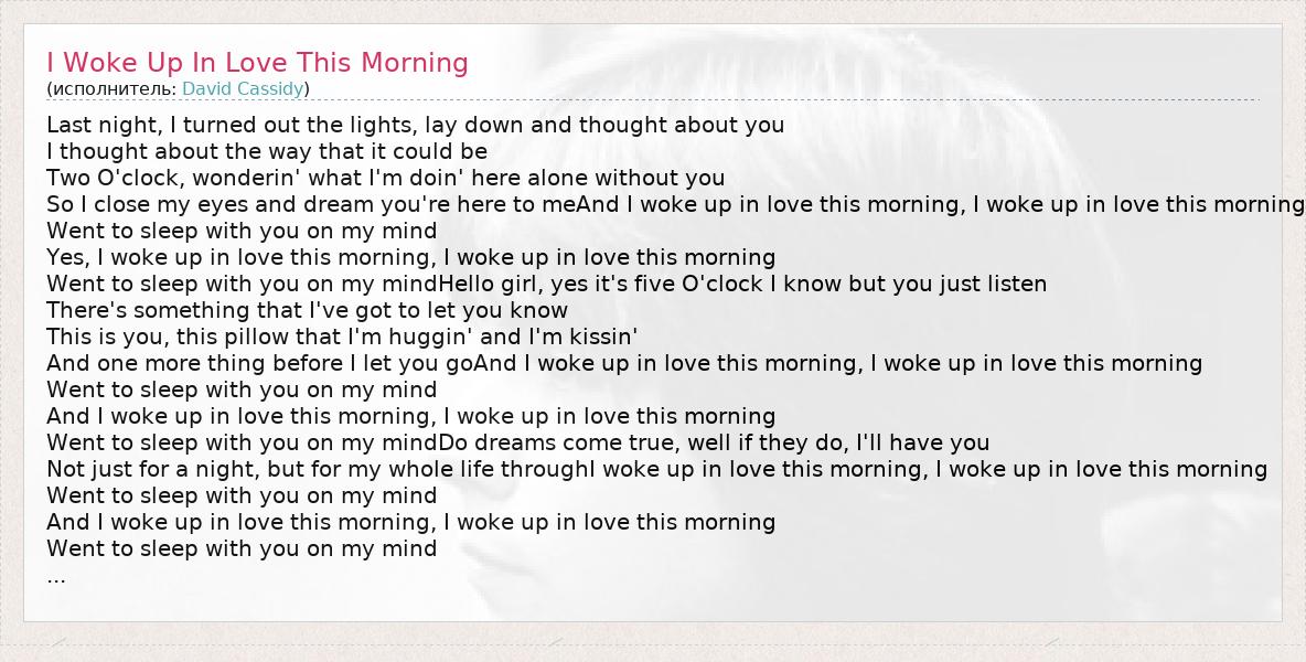 Last night, I turned out the lights, lay down and thought about you I thought about the way that it could be Two O'clock, wonderin' what I'm doin' here alone without you So I close my eyes and dream you're here to meAnd I woke up in love this morning, I woke up in love this morning Went to sleep with you on my mind Yes, I woke up in love this morning, I woke up in love this morning Went to sleep with you on my mindHello girl, yes it's five O'clock I know but you just listen There's something that I've got to let you know This is you, this pillow that I'm huggin' and I'm kissin' And one more thing before I let you goAnd I woke up in love this morning, I woke up in love this morning Went to sleep with you on my mind And I woke up in love this morning, I woke up in love this morning Went to sleep with you on my mindDo dreams come true, well if they do, I'll have you Not just for a night, but for my whole life throughI woke up in love this morning, I woke up in love this morning Went to sleep with you on my mind And I woke up in love this morning, I woke up in love this morning Went to sleep with you on my mind ...