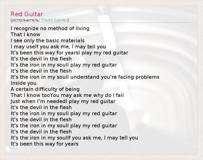 I recognize no method of living That I know I see only the basic materials I may useIf you ask me, I may tell you It's been this way for yearsI play my red guitar It's the devil in the flesh It's the iron in my soulI play my red guitar It's the devil in the flesh It's the iron in my soulI understand you're facing problems Inside you A certain difficulty of being That I know tooYou may ask me why do I fail Just when I'm neededI play my red guitar It's the devil in the flesh It's the iron in my soulI play my red guitar It's the devil in the flesh It's the iron in my soulI play my red guitar It's the devil in the flesh It's the iron in my soulIf you ask me, I may tell you It's been this way for years