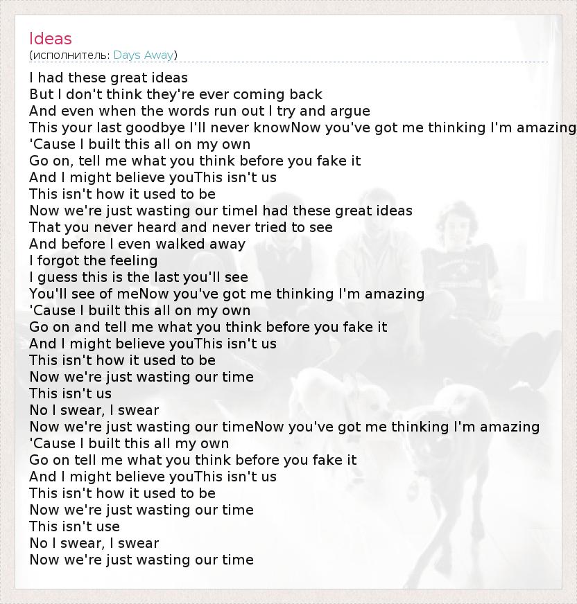 I had these great ideas But I don't think they're ever coming back And even when the words run out I try and argue This your last goodbye I'll never knowNow you've got me thinking I'm amazing 'Cause I built this all on my own Go on, tell me what you think before you fake it And I might believe youThis isn't us This isn't how it used to be Now we're just wasting our timeI had these great ideas That you never heard and never tried to see And before I even walked away I forgot the feeling I guess this is the last you'll see You'll see of meNow you've got me thinking I'm amazing 'Cause I built this all on my own Go on and tell me what you think before you fake it And I might believe youThis isn't us This isn't how it used to be Now we're just wasting our time This isn't us No I swear, I swear Now we're just wasting our timeNow you've got me thinking I'm amazing 'Cause I built this all my own Go on tell me what you think before you fake it And I might believe youThis isn't us This isn't how it used to be Now we're just wasting our time This isn't use No I swear, I swear Now we're just wasting our time