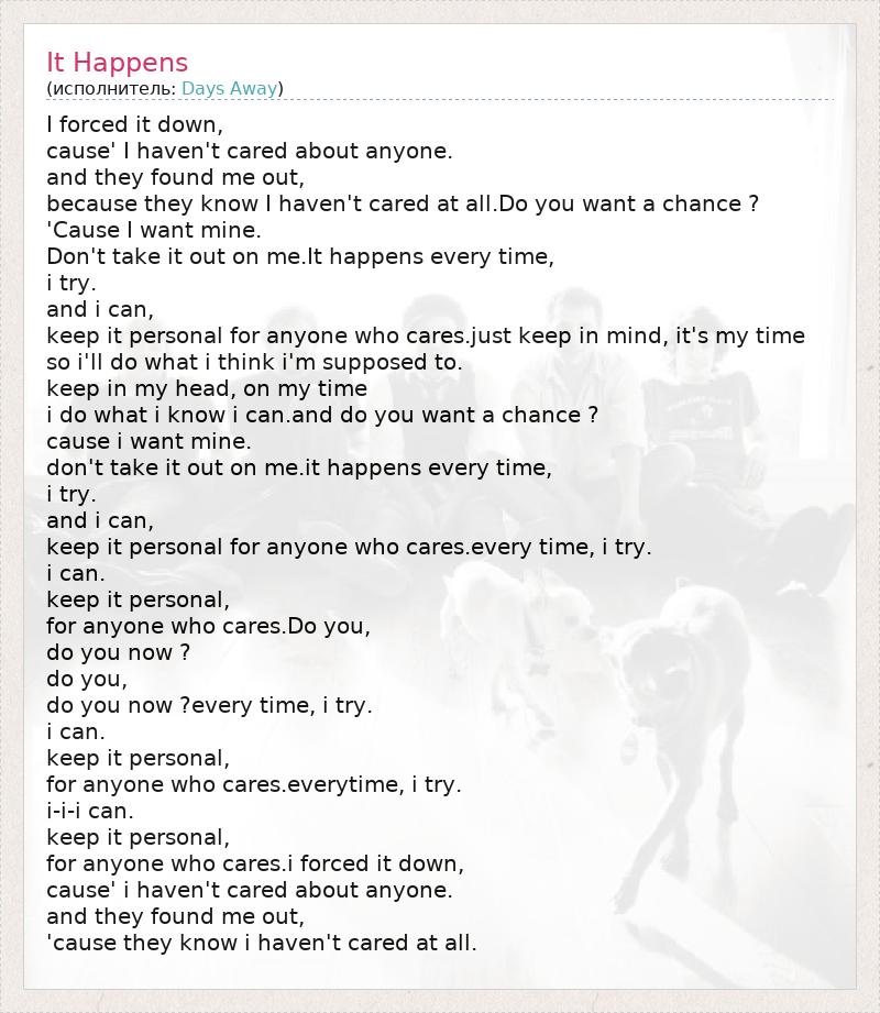 I forced it down, cause' I haven't cared about anyone. and they found me out, because they know I haven't cared at all.Do you want a chance ? 'Cause I want mine. Don't take it out on me.It happens every time, i try. and i can, keep it personal for anyone who cares.just keep in mind, it's my time so i'll do what i think i'm supposed to. keep in my head, on my time i do what i know i can.and do you want a chance ? cause i want mine. don't take it out on me.it happens every time, i try. and i can, keep it personal for anyone who cares.every time, i try. i can. keep it personal, for anyone who cares.Do you, do you now ? do you, do you now ?every time, i try. i can. keep it personal, for anyone who cares.everytime, i try. i-i-i can. keep it personal, for anyone who cares.i forced it down, cause' i haven't cared about anyone. and they found me out, 'cause they know i haven't cared at all.