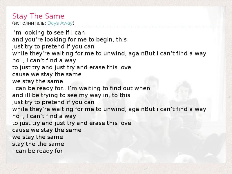 I'm looking to see if I can and you're looking for me to begin, this just try to pretend if you can while they're waiting for me to unwind, againBut i can't find a way no I, I can't find a way to just try and just try and erase this love cause we stay the same we stay the same I can be ready for...I'm waiting to find out when and ill be trying to see my way in, to this just try to pretend if you can while they're waiting for me to unwind, againBut i can't find a way no I, I can't find a way to just try and just try and erase this love cause we stay the same we stay the same stay the the same i can be ready for