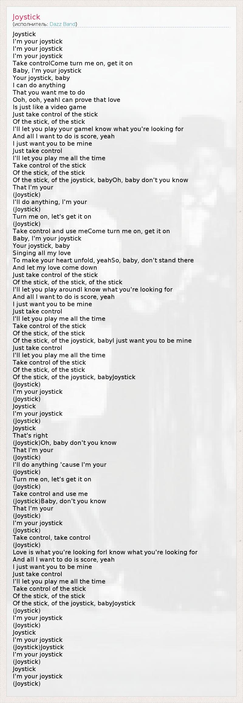 Joystick I'm your joystick I'm your joystick I'm your joystick Take controlCome turn me on, get it on Baby, I'm your joystick Your joystick, baby I can do anything That you want me to do Ooh, ooh, yeahI can prove that love Is just like a video game Just take control of the stick Of the stick, of the stick I'll let you play your gameI know what you're looking for And all I want to do is score, yeah I just want you to be mine Just take control I'll let you play me all the time Take control of the stick Of the stick, of the stick Of the stick, of the joystick, babyOh, baby don't you know That I'm your (Joystick) I'll do anything, I'm your (Joystick) Turn me on, let's get it on (Joystick) Take control and use meCome turn me on, get it on Baby, I'm your joystick Your joystick, baby Singing all my love To make your heart unfold, yeahSo, baby, don't stand there And let my love come down Just take control of the stick Of the stick, of the stick, of the stick I'll let you play aroundI know what you're looking for And all I want to do is score, yeah I just want you to be mine Just take control I'll let you play me all the time Take control of the stick Of the stick, of the stick Of the stick, of the joystick, babyI just want you to be mine Just take control I'll let you play me all the time Take control of the stick Of the stick, of the stick Of the stick, of the joystick, babyJoystick (Joystick) I'm your joystick (Joystick) Joystick I'm your joystick (Joystick) Joystick That's right (Joystick)Oh, baby don't you know That I'm your (Joystick) I'll do anything 'cause I'm your (Joystick) Turn me on, let's get it on (Joystick) Take control and use me (Joystick)Baby, don't you know That I'm your (Joystick) I'm your joystick (Joystick) Take control, take control (Joystick) Love is what you're looking forI know what you're looking for And all I want to do is score, yeah I just want you to be mine Just take control I'll let you play me all the time Take control of the stick Of the stick, of the stick Of the stick, of the joystick, babyJoystick (Joystick) I'm your joystick (Joystick) Joystick I'm your joystick (Joystick)Joystick I'm your joystick (Joystick) Joystick I'm your joystick (Joystick)