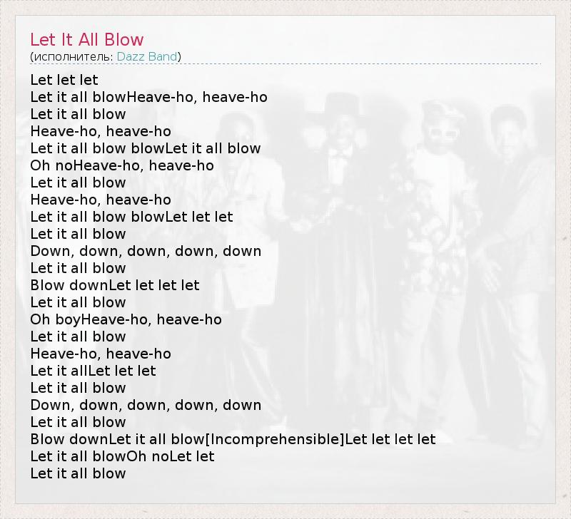 Let let let Let it all blowHeave-ho, heave-ho Let it all blow Heave-ho, heave-ho Let it all blow blowLet it all blow Oh noHeave-ho, heave-ho Let it all blow Heave-ho, heave-ho Let it all blow blowLet let let Let it all blow Down, down, down, down, down Let it all blow Blow downLet let let let Let it all blow Oh boyHeave-ho, heave-ho Let it all blow Heave-ho, heave-ho Let it allLet let let Let it all blow Down, down, down, down, down Let it all blow Blow downLet it all blow[Incomprehensible]Let let let let Let it all blowOh noLet let Let it all blow