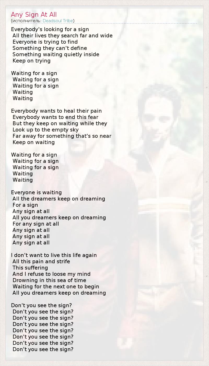 Каждый хочет увидеть знак, Который они искали и так и сяк, Каждый старается найти, То, что не может сам определить. Но что-то ждет незаметно внутри, Пытайся вновь. Ожидая знака Ожидая Каждый хочет вылечить свою боль, Каждый желает больше не бояться, Но они продолжают просто ждать, Подняв глаза к пустому небу. Вглядываясь вдаль, на то, что близко. Продолжайте ждать. Ожидая знака Ожидая Каждый ждет, А мечтатели продолжают мечтать. Ожидая знака, Любого знака. Все вы, мечтатели, продолжайте мечтать, О любом знаке вообще. Любом знаке вообще. Я не хочу пережить эту жизнь снова, Всю эту боль, все раздоры, Все мучения. Я отказываюсь терять свой разум, Утопая в этих морях времени, Ожидая следующего знака, чтобы начать. Все вы, мечтатели, продолжайте мечтать, Ты не видишь знака?