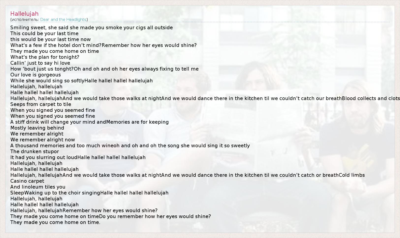 Smiling sweet, she said she made you smoke your cigs all outside This could be your last time this would be your last time now What's a few if the hotel don't mind?Remember how her eyes would shine? They made you come home on time What's the plan for tonight? Callin' just to say hi love How 'bout just us tonght?Oh and oh and oh her eyes always fixing to tell me Our love is gorgeous While she would sing so softlyHalle hallel hallel hallelujah Hallelujah, hallelujah Halle hallel hallel hallelujah Hallelujah, hallelujahAnd we would take those walks at nightAnd we would dance there in the kitchen til we couldn't catch our breathBlood collects and clots Seeps from carpet to tile When you signed you seemed fine When you signed you seemed fine A stiff drink will change your mind andMemories are for keeping Mostly leaving behind We remember alright We remember alright now A thousand memories and too much wineoh and oh and oh the song she would sing it so sweetly The drunken stupor It had you slurring out loudHalle hallel hallel hallelujah Hallelujah, hallelujah Halle hallel hallel hallelujah Hallelujah, hallelujahAnd we would take those walks at nightAnd we would dance there in the kitchen til we couldn't catch or breathCold limbs Casino carpet And linoleum tiles you SleepWaking up to the choir singingHalle hallel hallel hallelujah Hallelujah, hallelujah Halle hallel hallel hallelujah Hallelujah, hallelujahRemember how her eyes would shine? They made you come home on timeDo you remember how her eyes would shine? They made you come home on time.
