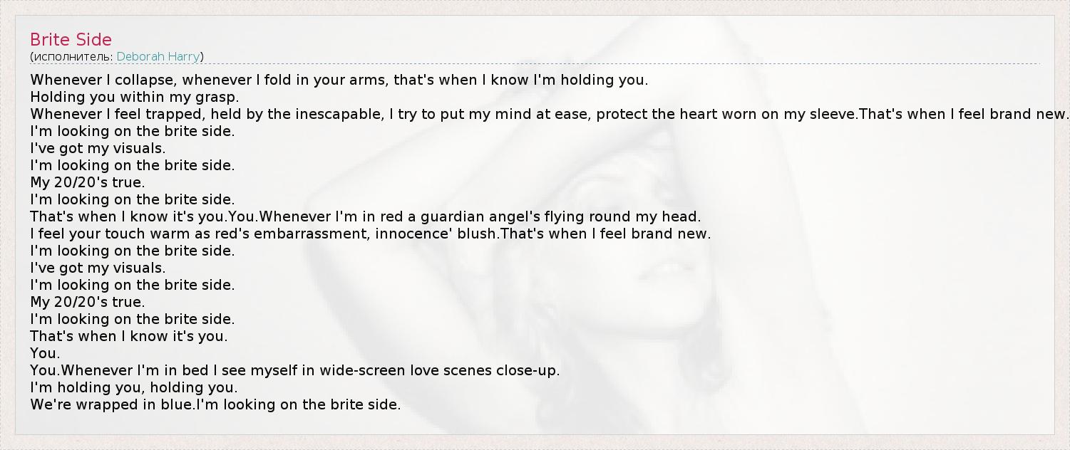 Whenever I collapse, whenever I fold in your arms, that's when I know I'm holding you. Holding you within my grasp. Whenever I feel trapped, held by the inescapable, I try to put my mind at ease, protect the heart worn on my sleeve.That's when I feel brand new. I'm looking on the brite side. I've got my visuals. I'm looking on the brite side. My 20/20's true. I'm looking on the brite side. That's when I know it's you.You.Whenever I'm in red a guardian angel's flying round my head. I feel your touch warm as red's embarrassment, innocence' blush.That's when I feel brand new. I'm looking on the brite side. I've got my visuals. I'm looking on the brite side. My 20/20's true. I'm looking on the brite side. That's when I know it's you. You. You.Whenever I'm in bed I see myself in wide-screen love scenes close-up. I'm holding you, holding you. We're wrapped in blue.I'm looking on the brite side.