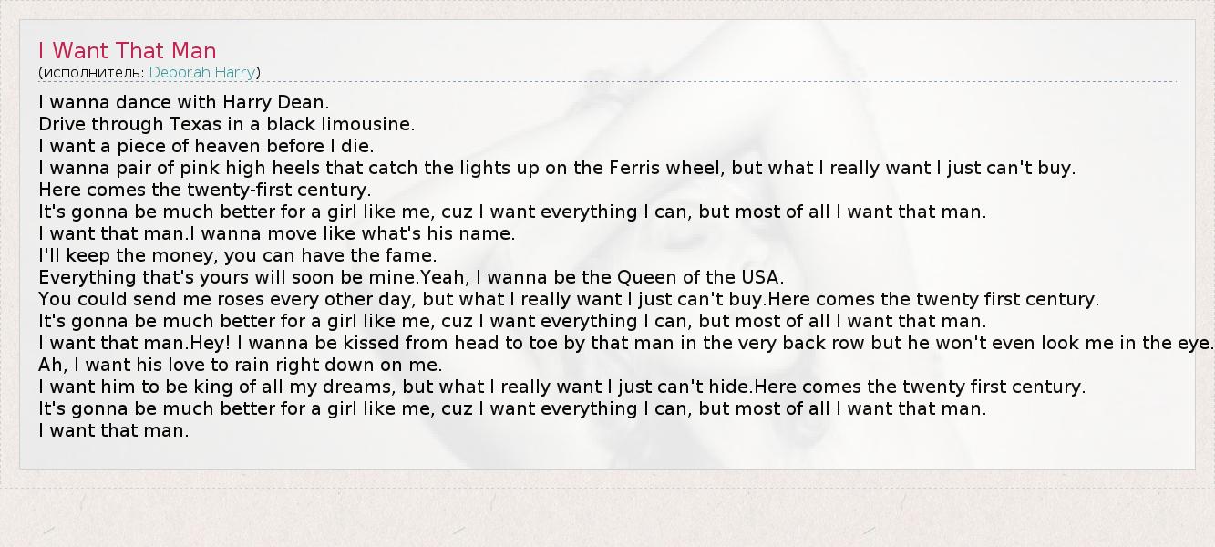 I wanna dance with Harry Dean. Drive through Texas in a black limousine. I want a piece of heaven before I die. I wanna pair of pink high heels that catch the lights up on the Ferris wheel, but what I really want I just can't buy. Here comes the twenty-first century. It's gonna be much better for a girl like me, cuz I want everything I can, but most of all I want that man. I want that man.I wanna move like what's his name. I'll keep the money, you can have the fame. Everything that's yours will soon be mine.Yeah, I wanna be the Queen of the USA. You could send me roses every other day, but what I really want I just can't buy.Here comes the twenty first century. It's gonna be much better for a girl like me, cuz I want everything I can, but most of all I want that man. I want that man.Hey! I wanna be kissed from head to toe by that man in the very back row but he won't even look me in the eye. Ah, I want his love to rain right down on me. I want him to be king of all my dreams, but what I really want I just can't hide.Here comes the twenty first century. It's gonna be much better for a girl like me, cuz I want everything I can, but most of all I want that man. I want that man.