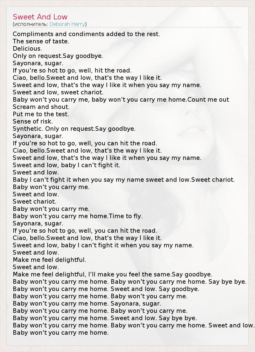 Compliments and condiments added to the rest. The sense of taste. Delicious. Only on request.Say goodbye. Sayonara, sugar. If you're so hot to go, well, hit the road. Ciao, bello.Sweet and low, that's the way I like it. Sweet and low, that's the way I like it when you say my name. Sweet and low, sweet chariot. Baby won't you carry me, baby won't you carry me home.Count me out Scream and shout. Put me to the test. Sense of risk. Synthetic. Only on request.Say goodbye. Sayonara, sugar. If you're so hot to go, well, you can hit the road. Ciao, bello.Sweet and low, that's the way I like it. Sweet and low, that's the way I like it when you say my name. Sweet and low, baby I can't fight it. Sweet and low. Baby I can't fight it when you say my name sweet and low.Sweet chariot. Baby won't you carry me. Sweet and low. Sweet chariot. Baby won't you carry me. Baby won't you carry me home.Time to fly. Sayonara, sugar. If you're so hot to go, well, you can hit the road. Ciao, bello.Sweet and low, that's the way I like it. Sweet and low, baby I can't fight it when you say my name. Sweet and low. Make me feel delightful. Sweet and low. Make me feel delightful, I'll make you feel the same.Say goodbye. Baby won't you carry me home. Baby won't you carry me home. Say bye bye. Baby won't you carry me home. Sweet and low. Say goodbye. Baby won't you carry me home. Baby won't you carry me. Baby won't you carry me home. Sayonara, sugar. Baby won't you carry me home. Baby won't you carry me. Baby won't you carry me home. Sweet and low. Say bye bye. Baby won't you carry me home. Baby won't you carry me home. Sweet and low. Baby won't you carry me home.