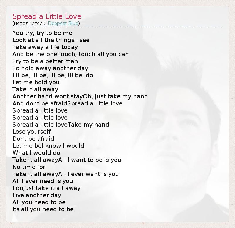 You try, try to be me Look at all the things I see Take away a life today And be the oneTouch, touch all you can Try to be a better man To hold away another day I'll be, Ill be, Ill be, Ill beI do Let me hold you Take it all away Another hand wont stayOh, just take my hand And dont be afraidSpread a little love Spread a little love Spread a little love Spread a little loveTake my hand Lose yourself Dont be afraid Let me beI know I would What I would do Take it all awayAll I want to be is you No time for Take it all awayAll I ever want is you All I ever need is you I doJust take it all away Live another day All you need to be Its all you need to be