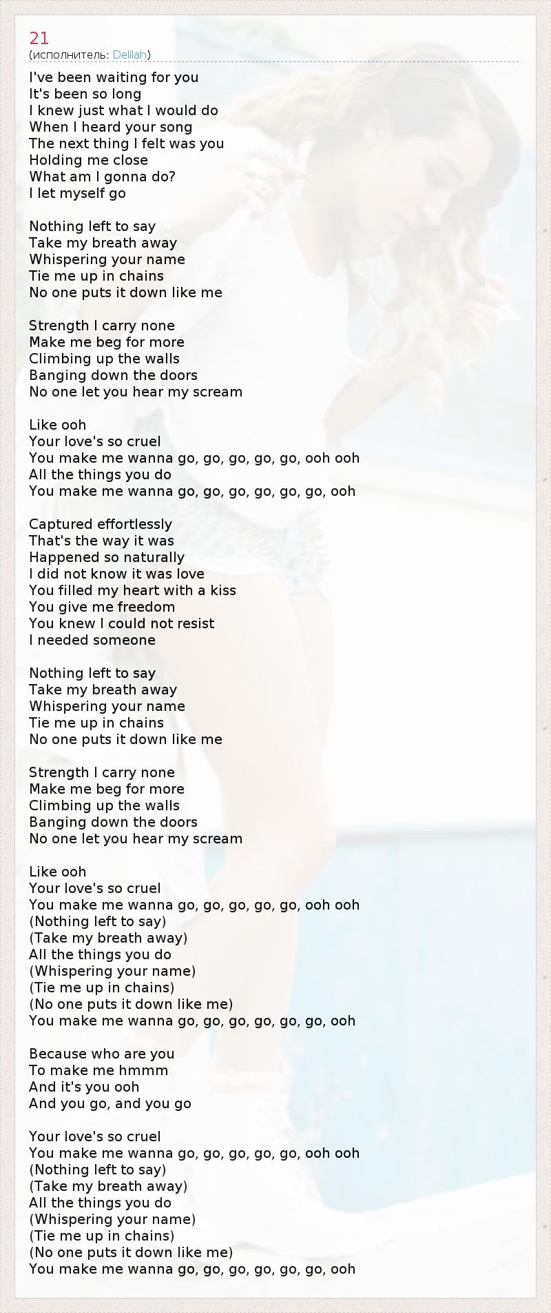 I've been waiting for you It's been so long I knew just what I would do When I heard your song The next thing I felt was you Holding me close What am I gonna do? I let myself go Nothing left to say Take my breath away Whispering your name Tie me up in chains No one puts it down like me Strength I carry none Make me beg for more Climbing up the walls Banging down the doors No one let you hear my scream Like ooh Your love's so cruel You make me wanna go, go, go, go, go, ooh ooh All the things you do You make me wanna go, go, go, go, go, go, ooh Captured effortlessly That's the way it was Happened so naturally I did not know it was love You filled my heart with a kiss You give me freedom You knew I could not resist I needed someone Nothing left to say Take my breath away Whispering your name Tie me up in chains No one puts it down like me Strength I carry none Make me beg for more Climbing up the walls Banging down the doors No one let you hear my scream Like ooh Your love's so cruel You make me wanna go, go, go, go, go, ooh ooh (Nothing left to say) (Take my breath away) All the things you do (Whispering your name) (Tie me up in chains) (No one puts it down like me) You make me wanna go, go, go, go, go, go, ooh Because who are you To make me hmmm And it's you ooh And you go, and you go Your love's so cruel You make me wanna go, go, go, go, go, ooh ooh (Nothing left to say) (Take my breath away) All the things you do (Whispering your name) (Tie me up in chains) (No one puts it down like me) You make me wanna go, go, go, go, go, go, ooh