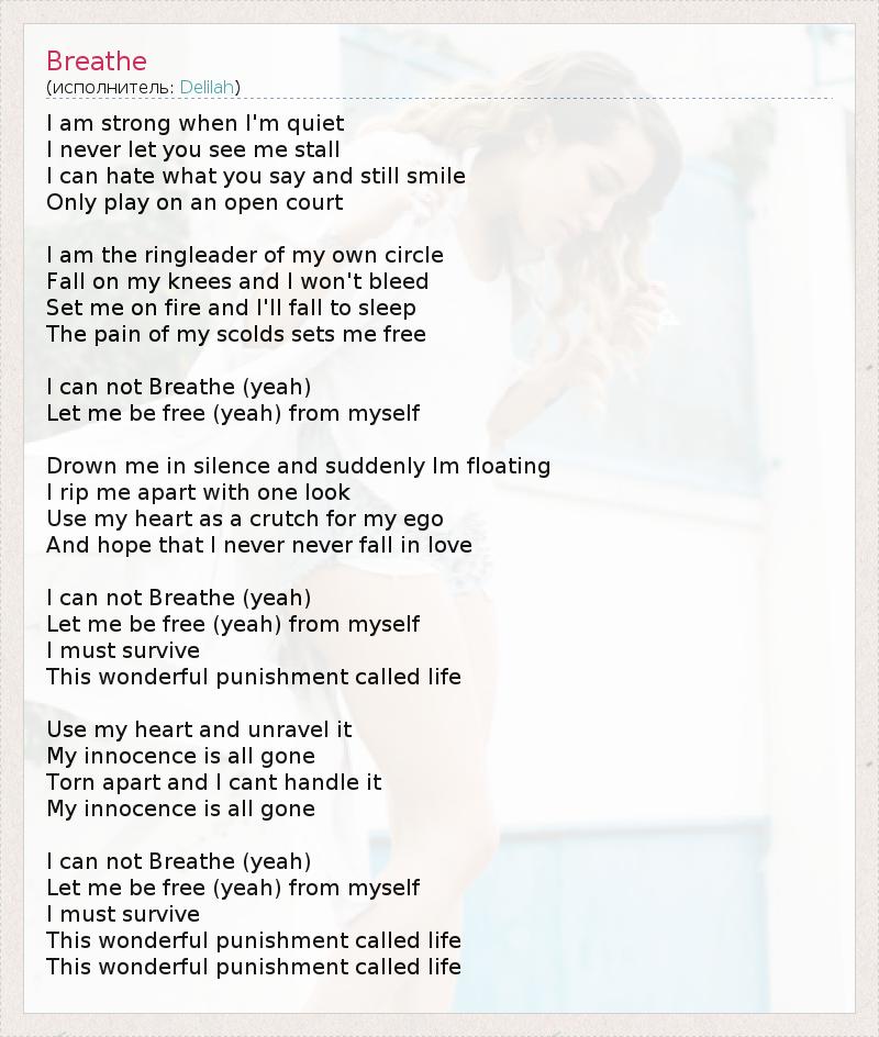 I am strong when I'm quiet I never let you see me stall I can hate what you say and still smile Only play on an open court I am the ringleader of my own circle Fall on my knees and I won't bleed Set me on fire and I'll fall to sleep The pain of my scolds sets me free I can not Breathe (yeah) Let me be free (yeah) from myself Drown me in silence and suddenly Im floating I rip me apart with one look Use my heart as a crutch for my ego And hope that I never never fall in love I can not Breathe (yeah) Let me be free (yeah) from myself I must survive This wonderful punishment called life Use my heart and unravel it My innocence is all gone Torn apart and I cant handle it My innocence is all gone I can not Breathe (yeah) Let me be free (yeah) from myself I must survive This wonderful punishment called life This wonderful punishment called life