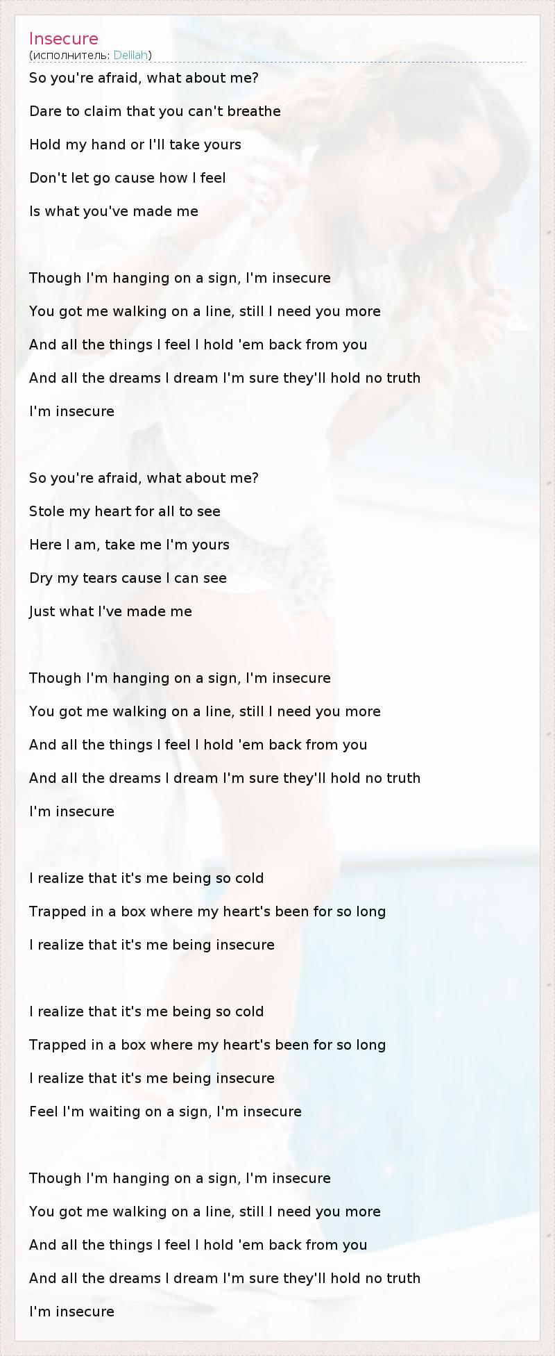 So you're afraid, what about me? Dare to claim that you can't breathe Hold my hand or I'll take yours Don't let go cause how I feel Is what you've made me Though I'm hanging on a sign, I'm insecure You got me walking on a line, still I need you more And all the things I feel I hold 'em back from you And all the dreams I dream I'm sure they'll hold no truth I'm insecure So you're afraid, what about me? Stole my heart for all to see Here I am, take me I'm yours Dry my tears cause I can see Just what I've made me Though I'm hanging on a sign, I'm insecure You got me walking on a line, still I need you more And all the things I feel I hold 'em back from you And all the dreams I dream I'm sure they'll hold no truth I'm insecure I realize that it's me being so cold Trapped in a box where my heart's been for so long I realize that it's me being insecure I realize that it's me being so cold Trapped in a box where my heart's been for so long I realize that it's me being insecure Feel I'm waiting on a sign, I'm insecure Though I'm hanging on a sign, I'm insecure You got me walking on a line, still I need you more And all the things I feel I hold 'em back from you And all the dreams I dream I'm sure they'll hold no truth I'm insecure