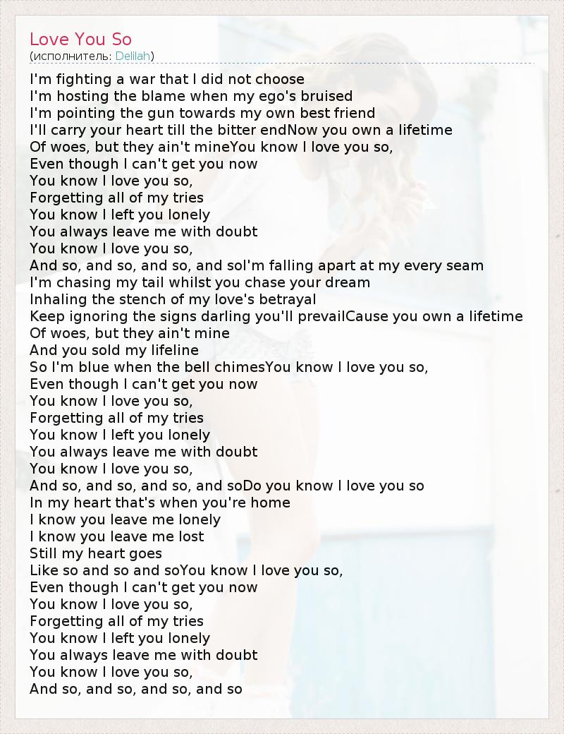 I'm fighting a war that I did not choose I'm hosting the blame when my ego's bruised I'm pointing the gun towards my own best friend I'll carry your heart till the bitter endNow you own a lifetime Of woes, but they ain't mineYou know I love you so, Even though I can't get you now You know I love you so, Forgetting all of my tries You know I left you lonely You always leave me with doubt You know I love you so, And so, and so, and so, and soI'm falling apart at my every seam I'm chasing my tail whilst you chase your dream Inhaling the stench of my love's betrayal Keep ignoring the signs darling you'll prevailCause you own a lifetime Of woes, but they ain't mine And you sold my lifeline So I'm blue when the bell chimesYou know I love you so, Even though I can't get you now You know I love you so, Forgetting all of my tries You know I left you lonely You always leave me with doubt You know I love you so, And so, and so, and so, and soDo you know I love you so In my heart that's when you're home I know you leave me lonely I know you leave me lost Still my heart goes Like so and so and soYou know I love you so, Even though I can't get you now You know I love you so, Forgetting all of my tries You know I left you lonely You always leave me with doubt You know I love you so, And so, and so, and so, and so