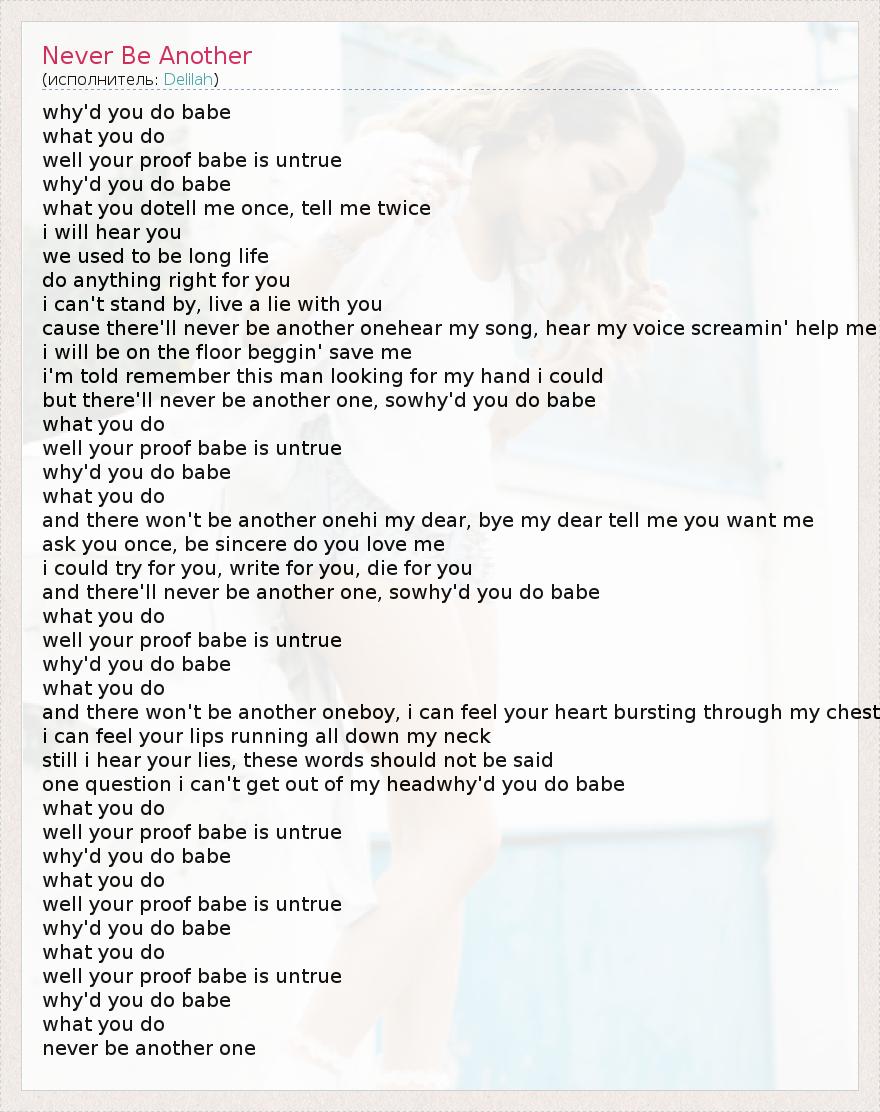 why'd you do babe what you do well your proof babe is untrue why'd you do babe what you dotell me once, tell me twice i will hear you we used to be long life do anything right for you i can't stand by, live a lie with you cause there'll never be another onehear my song, hear my voice screamin' help me i will be on the floor beggin' save me i'm told remember this man looking for my hand i could but there'll never be another one, sowhy'd you do babe what you do well your proof babe is untrue why'd you do babe what you do and there won't be another onehi my dear, bye my dear tell me you want me ask you once, be sincere do you love me i could try for you, write for you, die for you and there'll never be another one, sowhy'd you do babe what you do well your proof babe is untrue why'd you do babe what you do and there won't be another oneboy, i can feel your heart bursting through my chest i can feel your lips running all down my neck still i hear your lies, these words should not be said one question i can't get out of my headwhy'd you do babe what you do well your proof babe is untrue why'd you do babe what you do well your proof babe is untrue why'd you do babe what you do well your proof babe is untrue why'd you do babe what you do never be another one