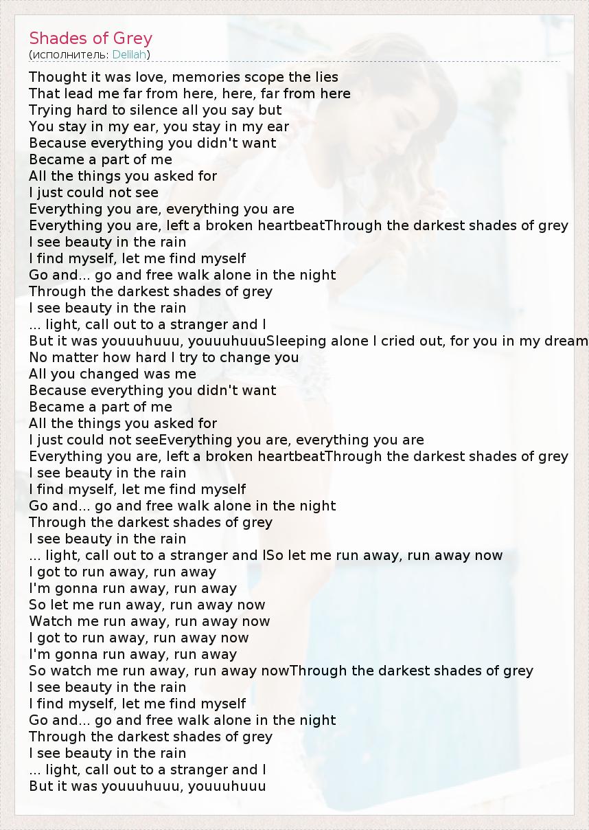 Thought it was love, memories scope the lies That lead me far from here, here, far from here Trying hard to silence all you say but You stay in my ear, you stay in my ear Because everything you didn't want Became a part of me All the things you asked for I just could not see Everything you are, everything you are Everything you are, left a broken heartbeatThrough the darkest shades of grey I see beauty in the rain I find myself, let me find myself Go and... go and free walk alone in the night Through the darkest shades of grey I see beauty in the rain ... light, call out to a stranger and I But it was youuuhuuu, youuuhuuuSleeping alone I cried out, for you in my dream No matter how hard I try to change you All you changed was me Because everything you didn't want Became a part of me All the things you asked for I just could not seeEverything you are, everything you are Everything you are, left a broken heartbeatThrough the darkest shades of grey I see beauty in the rain I find myself, let me find myself Go and... go and free walk alone in the night Through the darkest shades of grey I see beauty in the rain ... light, call out to a stranger and ISo let me run away, run away now I got to run away, run away I'm gonna run away, run away So let me run away, run away now Watch me run away, run away now I got to run away, run away now I'm gonna run away, run away So watch me run away, run away nowThrough the darkest shades of grey I see beauty in the rain I find myself, let me find myself Go and... go and free walk alone in the night Through the darkest shades of grey I see beauty in the rain ... light, call out to a stranger and I But it was youuuhuuu, youuuhuuu
