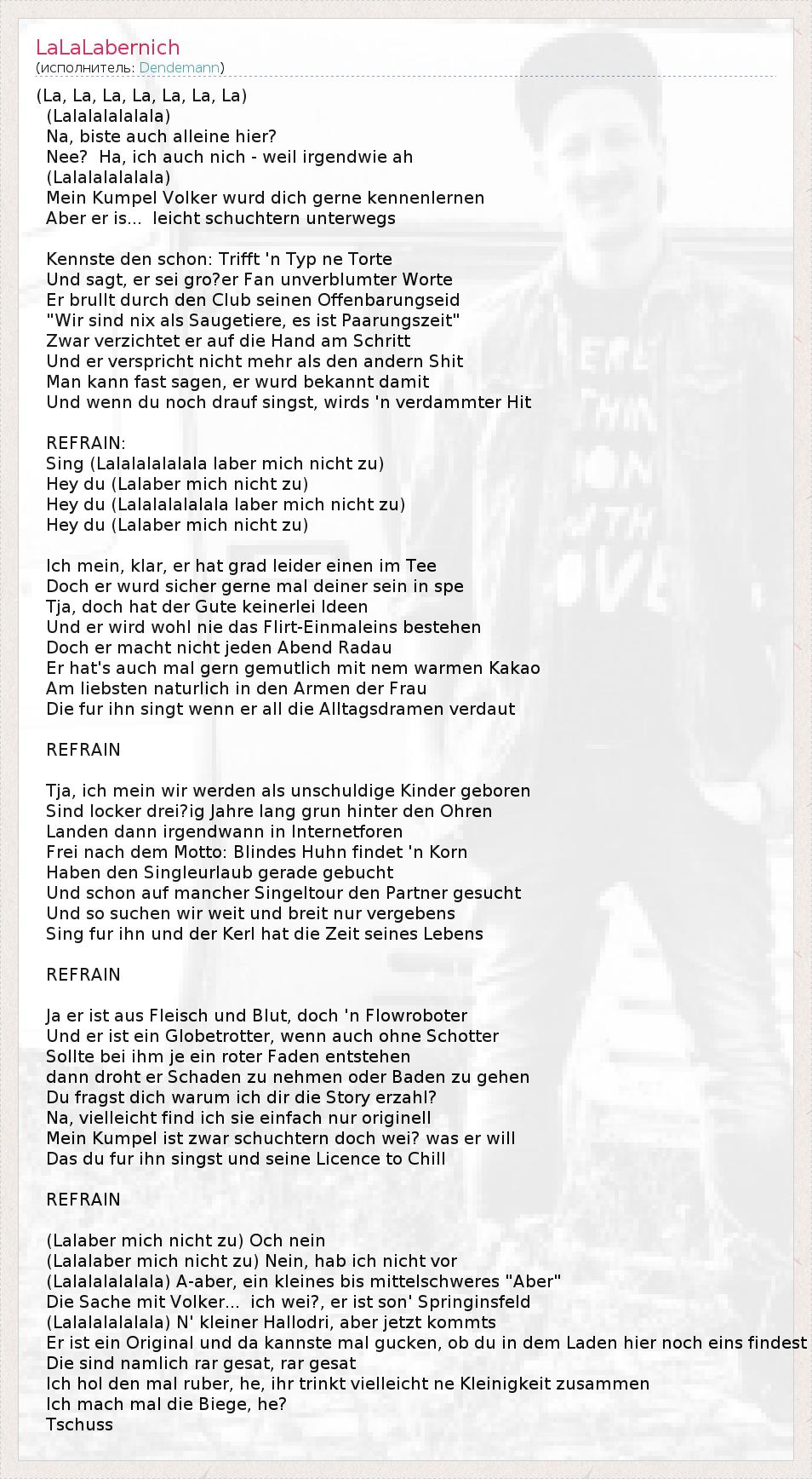 (La, La, La, La, La, La, La) (Lalalalalalala) Na, biste auch alleine hier? Nee? Ha, ich auch nich - weil irgendwie ah (Lalalalalalala) Mein Kumpel Volker wurd dich gerne kennenlernen Aber er is... leicht schuchtern unterwegs Kennste den schon: Trifft 'n Typ ne Torte Und sagt, er sei gro?er Fan unverblumter Worte Er brullt durch den Club seinen Offenbarungseid "Wir sind nix als Saugetiere, es ist Paarungszeit" Zwar verzichtet er auf die Hand am Schritt Und er verspricht nicht mehr als den andern Shit Man kann fast sagen, er wurd bekannt damit Und wenn du noch drauf singst, wirds 'n verdammter Hit REFRAIN: Sing (Lalalalalalala laber mich nicht zu) Hey du (Lalaber mich nicht zu) Hey du (Lalalalalalala laber mich nicht zu) Hey du (Lalaber mich nicht zu) Ich mein, klar, er hat grad leider einen im Tee Doch er wurd sicher gerne mal deiner sein in spe Tja, doch hat der Gute keinerlei Ideen Und er wird wohl nie das Flirt-Einmaleins bestehen Doch er macht nicht jeden Abend Radau Er hat's auch mal gern gemutlich mit nem warmen Kakao Am liebsten naturlich in den Armen der Frau Die fur ihn singt wenn er all die Alltagsdramen verdaut REFRAIN Tja, ich mein wir werden als unschuldige Kinder geboren Sind locker drei?ig Jahre lang grun hinter den Ohren Landen dann irgendwann in Internetforen Frei nach dem Motto: Blindes Huhn findet 'n Korn Haben den Singleurlaub gerade gebucht Und schon auf mancher Singeltour den Partner gesucht Und so suchen wir weit und breit nur vergebens Sing fur ihn und der Kerl hat die Zeit seines Lebens REFRAIN Ja er ist aus Fleisch und Blut, doch 'n Flowroboter Und er ist ein Globetrotter, wenn auch ohne Schotter Sollte bei ihm je ein roter Faden entstehen dann droht er Schaden zu nehmen oder Baden zu gehen Du fragst dich warum ich dir die Story erzahl? Na, vielleicht find ich sie einfach nur originell Mein Kumpel ist zwar schuchtern doch wei? was er will Das du fur ihn singst und seine Licence to Chill REFRAIN (Lalaber mich nicht zu) Och nein (Lalalaber mich nicht zu) Nein, hab ich nicht vor (Lalalalalalala) A-aber, ein kleines bis mittelschweres "Aber" Die Sache mit Volker... ich wei?, er ist son' Springinsfeld (Lalalalalalala) N' kleiner Hallodri, aber jetzt kommts Er ist ein Original und da kannste mal gucken, ob du in dem Laden hier noch eins findest Die sind namlich rar gesat, rar gesat Ich hol den mal ruber, he, ihr trinkt vielleicht ne Kleinigkeit zusammen Ich mach mal die Biege, he? Tschuss