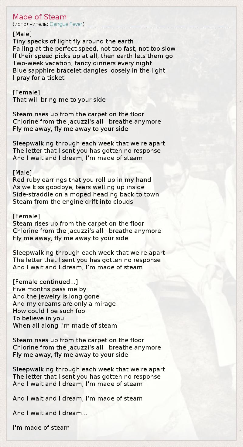 [Male] Tiny specks of light fly around the earth Falling at the perfect speed, not too fast, not too slow If their speed picks up at all, then earth lets them go Two-week vacation, fancy dinners every night Blue sapphire bracelet dangles loosely in the light I pray for a ticket [Female] That will bring me to your side Steam rises up from the carpet on the floor Chlorine from the jacuzzi's all I breathe anymore Fly me away, fly me away to your side Sleepwalking through each week that we're apart The letter that I sent you has gotten no response And I wait and I dream, I'm made of steam [Male] Red ruby earrings that you roll up in my hand As we kiss goodbye, tears welling up inside Side-straddle on a moped heading back to town Steam from the engine drift into clouds [Female] Steam rises up from the carpet on the floor Chlorine from the jacuzzi's all I breathe anymore Fly me away, fly me away to your side Sleepwalking through each week that we're apart The letter that I sent you has gotten no response And I wait and I dream, I'm made of steam [Female continued...] Five months pass me by And the jewelry is long gone And my dreams are only a mirage How could I be such fool To believe in you When all along I'm made of steam Steam rises up from the carpet on the floor Chlorine from the jacuzzi's all I breathe anymore Fly me away, fly me away to your side Sleepwalking through each week that we're apart The letter that I sent you has gotten no response And I wait and I dream, I'm made of steam And I wait and I dream, I'm made of steam And I wait and I dream... I'm made of steam