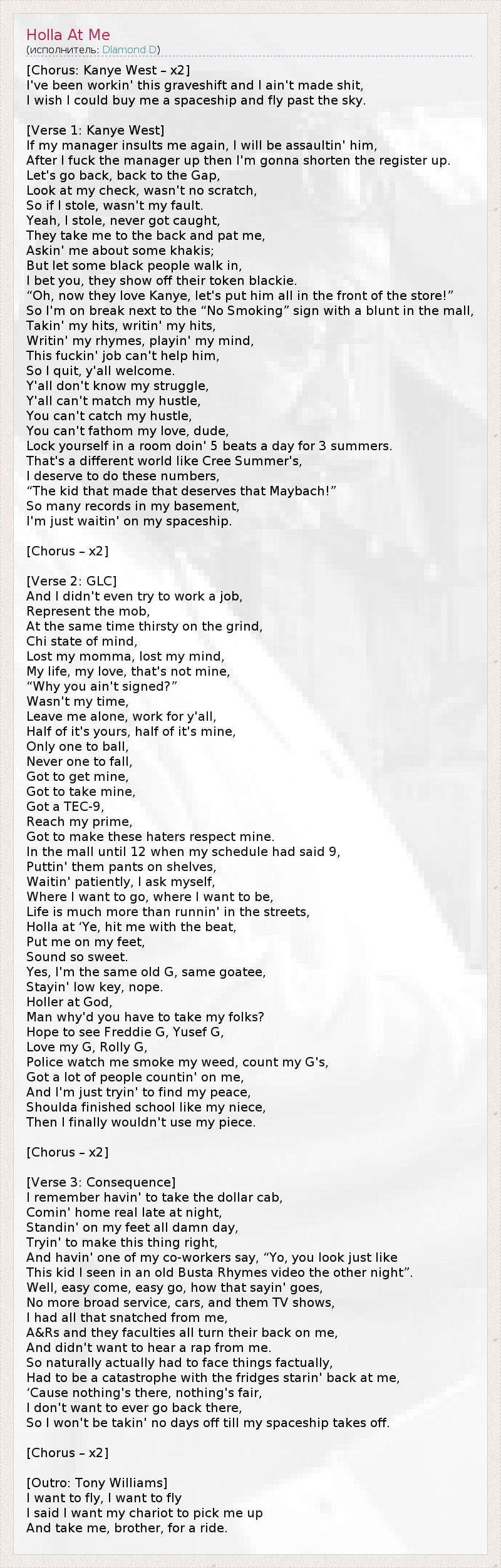 [Chorus: Kanye West – x2] I've been workin' this graveshift and I ain't made shit, I wish I could buy me a spaceship and fly past the sky. [Verse 1: Kanye West] If my manager insults me again, I will be assaultin' him, After I fuck the manager up then I'm gonna shorten the register up. Let's go back, back to the Gap, Look at my check, wasn't no scratch, So if I stole, wasn't my fault. Yeah, I stole, never got caught, They take me to the back and pat me, Askin' me about some khakis; But let some black people walk in, I bet you, they show off their token blackie. “Oh, now they love Kanye, let's put him all in the front of the store!” So I'm on break next to the “No Smoking” sign with a blunt in the mall, Takin' my hits, writin' my hits, Writin' my rhymes, playin' my mind, This fuckin' job can't help him, So I quit, y'all welcome. Y'all don't know my struggle, Y'all can't match my hustle, You can't catch my hustle, You can't fathom my love, dude, Lock yourself in a room doin' 5 beats a day for 3 summers. That's a different world like Cree Summer's, I deserve to do these numbers, “The kid that made that deserves that Maybach!” So many records in my basement, I'm just waitin' on my spaceship. [Chorus – x2] [Verse 2: GLC] And I didn't even try to work a job, Represent the mob, At the same time thirsty on the grind, Chi state of mind, Lost my momma, lost my mind, My life, my love, that's not mine, “Why you ain't signed?” Wasn't my time, Leave me alone, work for y'all, Half of it's yours, half of it's mine, Only one to ball, Never one to fall, Got to get mine, Got to take mine, Got a TEC-9, Reach my prime, Got to make these haters respect mine. In the mall until 12 when my schedule had said 9, Puttin' them pants on shelves, Waitin' patiently, I ask myself, Where I want to go, where I want to be, Life is much more than runnin' in the streets, Holla at ‘Ye, hit me with the beat, Put me on my feet, Sound so sweet. Yes, I'm the same old G, same goatee, Stayin' low key, nope. Holler at God, Man why'd you have to take my folks? Hope to see Freddie G, Yusef G, Love my G, Rolly G, Police watch me smoke my weed, count my G's, Got a lot of people countin' on me, And I'm just tryin' to find my peace, Shoulda finished school like my niece, Then I finally wouldn't use my piece. [Chorus – x2] [Verse 3: Consequence] I remember havin' to take the dollar cab, Comin' home real late at night, Standin' on my feet all damn day, Tryin' to make this thing right, And havin' one of my co-workers say, “Yo, you look just like This kid I seen in an old Busta Rhymes video the other night”. Well, easy come, easy go, how that sayin' goes, No more broad service, cars, and them TV shows, I had all that snatched from me, A&Rs and they faculties all turn their back on me, And didn't want to hear a rap from me. So naturally actually had to face things factually, Had to be a catastrophe with the fridges starin' back at me, ‘Cause nothing's there, nothing's fair, I don't want to ever go back there, So I won't be takin' no days off till my spaceship takes off. [Chorus – x2] [Outro: Tony Williams] I want to fly, I want to fly I said I want my chariot to pick me up And take me, brother, for a ride.