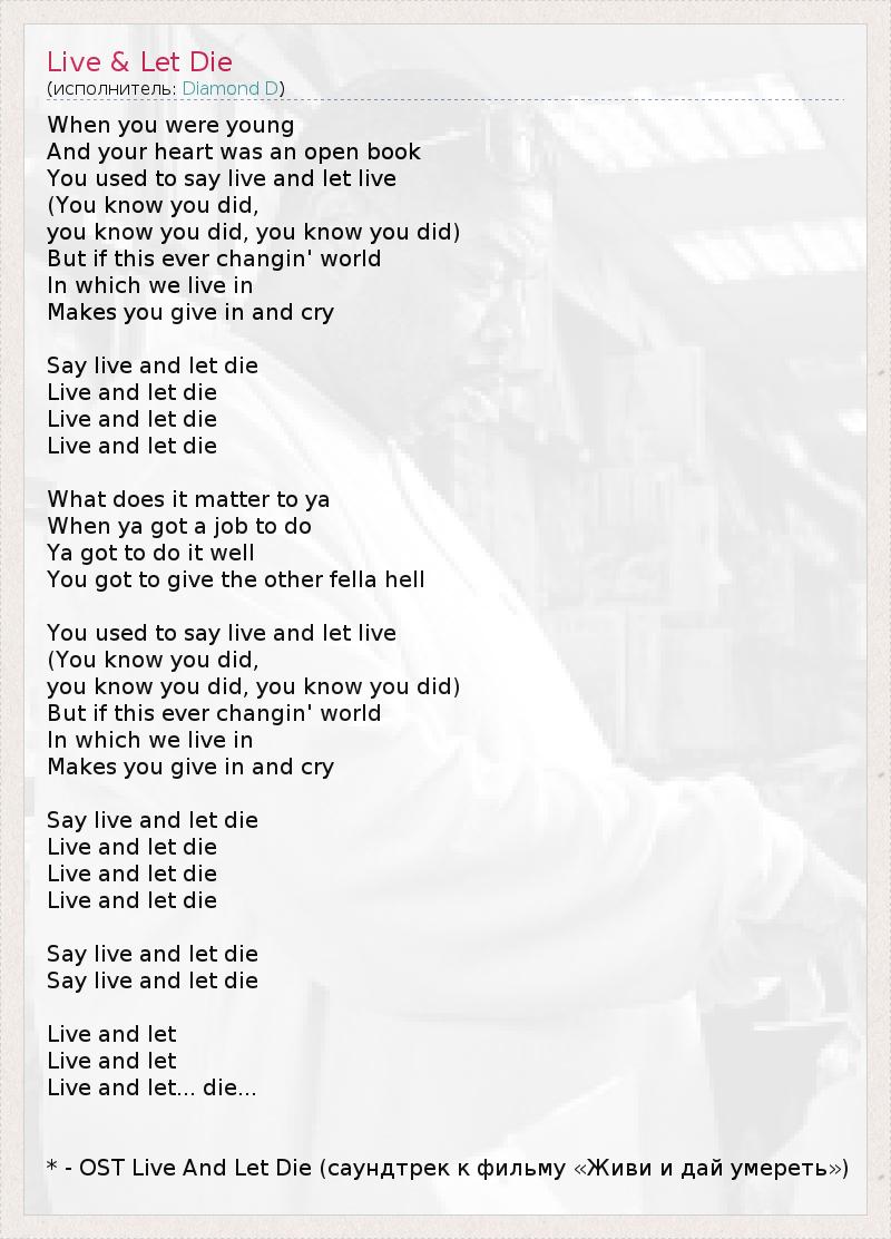 When you were young And your heart was an open book You used to say live and let live (You know you did, you know you did, you know you did) But if this ever changin' world In which we live in Makes you give in and cry Say live and let die Live and let die Live and let die Live and let die What does it matter to ya When ya got a job to do Ya got to do it well You got to give the other fella hell You used to say live and let live (You know you did, you know you did, you know you did) But if this ever changin' world In which we live in Makes you give in and cry Say live and let die Live and let die Live and let die Live and let die Say live and let die Say live and let die Live and let Live and let Live and let... die... * - OST Live And Let Die (саундтрек к фильму «Живи и дай умереть»)