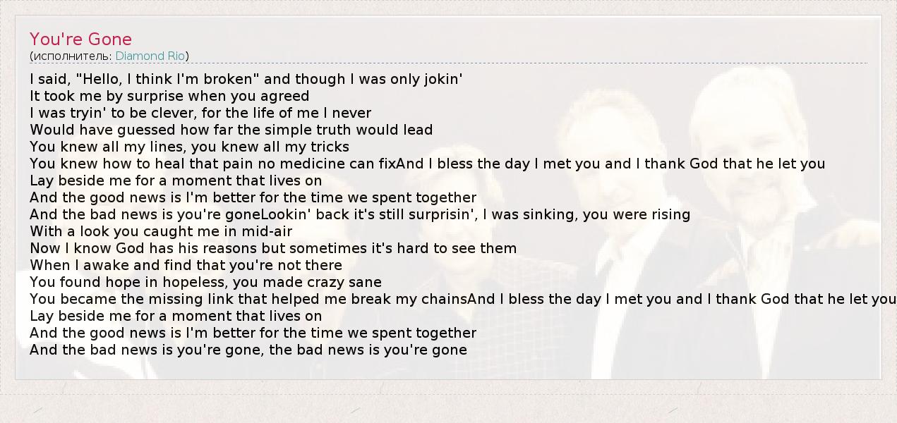 I said, "Hello, I think I'm broken" and though I was only jokin' It took me by surprise when you agreed I was tryin' to be clever, for the life of me I never Would have guessed how far the simple truth would lead You knew all my lines, you knew all my tricks You knew how to heal that pain no medicine can fixAnd I bless the day I met you and I thank God that he let you Lay beside me for a moment that lives on And the good news is I'm better for the time we spent together And the bad news is you're goneLookin' back it's still surprisin', I was sinking, you were rising With a look you caught me in mid-air Now I know God has his reasons but sometimes it's hard to see them When I awake and find that you're not there You found hope in hopeless, you made crazy sane You became the missing link that helped me break my chainsAnd I bless the day I met you and I thank God that he let you Lay beside me for a moment that lives on And the good news is I'm better for the time we spent together And the bad news is you're gone, the bad news is you're gone