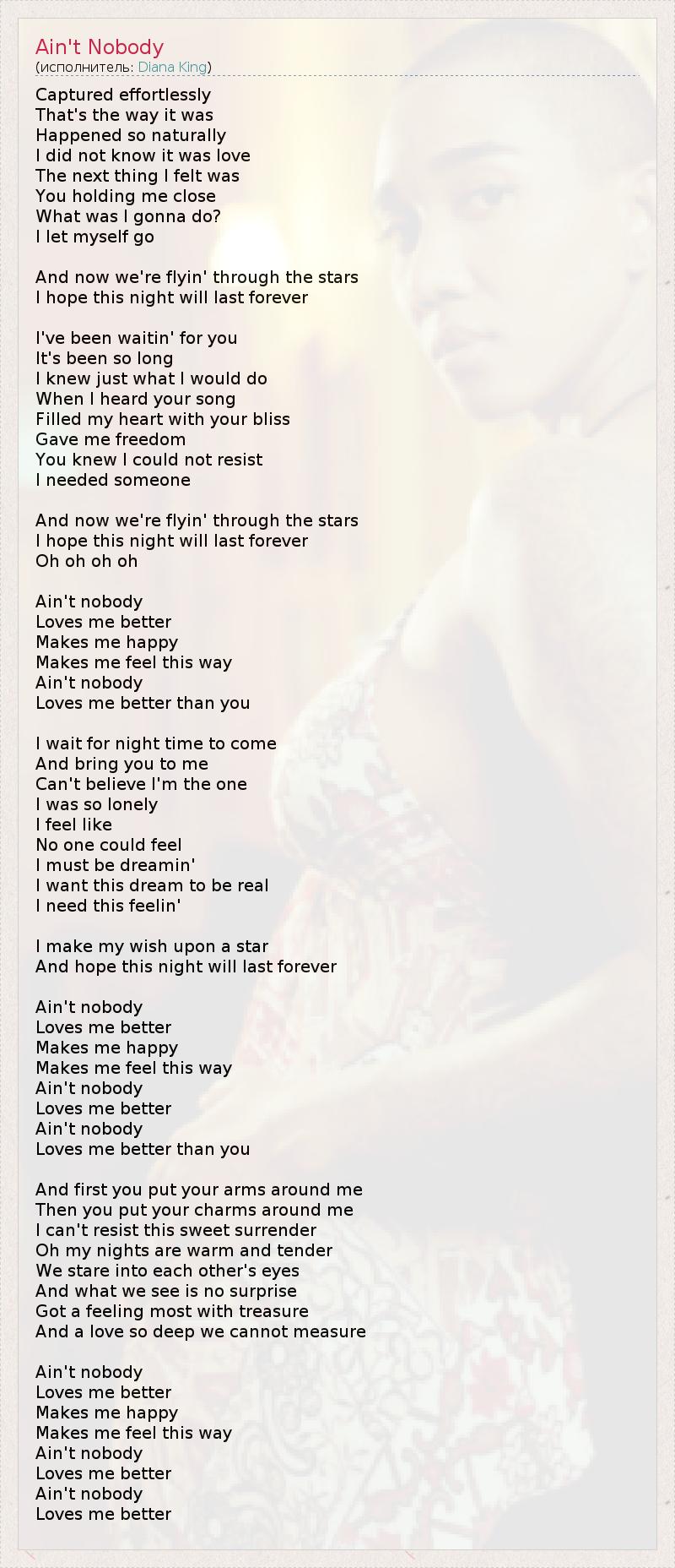 Captured effortlessly That's the way it was Happened so naturally I did not know it was love The next thing I felt was You holding me close What was I gonna do? I let myself go And now we're flyin' through the stars I hope this night will last forever I've been waitin' for you It's been so long I knew just what I would do When I heard your song Filled my heart with your bliss Gave me freedom You knew I could not resist I needed someone And now we're flyin' through the stars I hope this night will last forever Oh oh oh oh Ain't nobody Loves me better Makes me happy Makes me feel this way Ain't nobody Loves me better than you I wait for night time to come And bring you to me Can't believe I'm the one I was so lonely I feel like No one could feel I must be dreamin' I want this dream to be real I need this feelin' I make my wish upon a star And hope this night will last forever Ain't nobody Loves me better Makes me happy Makes me feel this way Ain't nobody Loves me better Ain't nobody Loves me better than you And first you put your arms around me Then you put your charms around me I can't resist this sweet surrender Oh my nights are warm and tender We stare into each other's eyes And what we see is no surprise Got a feeling most with treasure And a love so deep we cannot measure Ain't nobody Loves me better Makes me happy Makes me feel this way Ain't nobody Loves me better Ain't nobody Loves me better