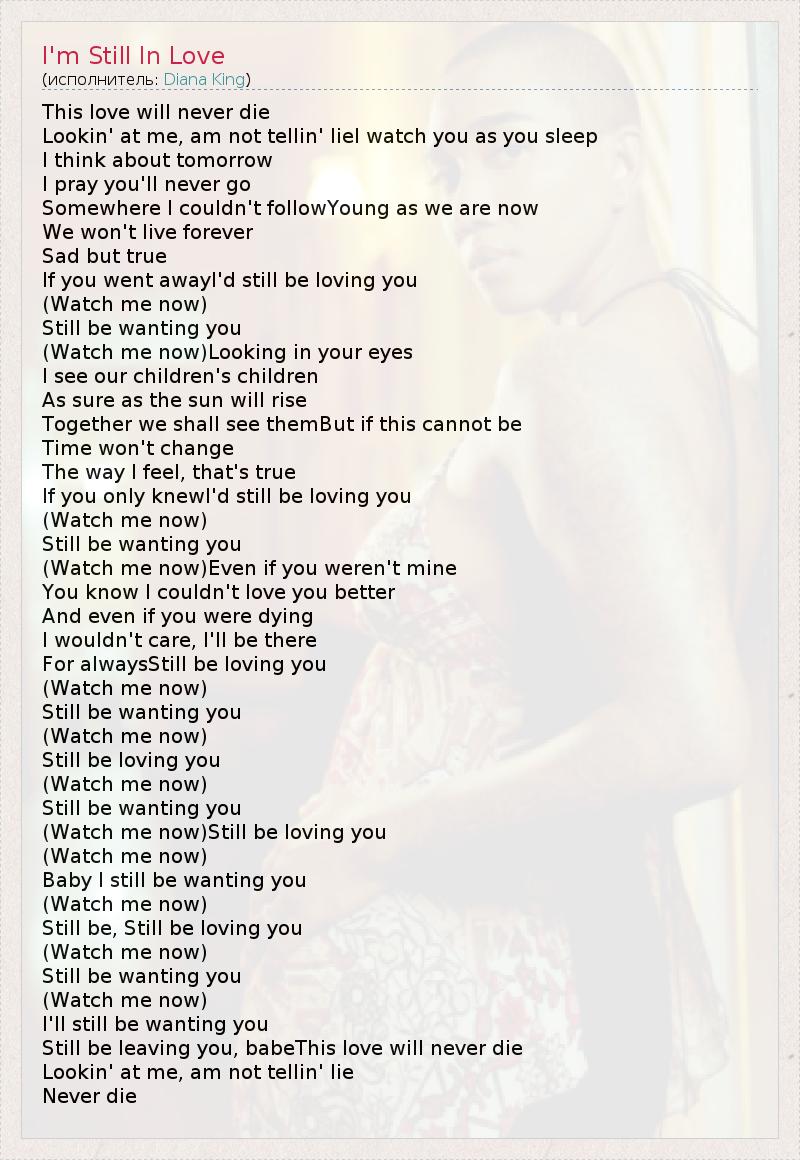 This love will never die Lookin' at me, am not tellin' lieI watch you as you sleep I think about tomorrow I pray you'll never go Somewhere I couldn't followYoung as we are now We won't live forever Sad but true If you went awayI'd still be loving you (Watch me now) Still be wanting you (Watch me now)Looking in your eyes I see our children's children As sure as the sun will rise Together we shall see themBut if this cannot be Time won't change The way I feel, that's true If you only knewI'd still be loving you (Watch me now) Still be wanting you (Watch me now)Even if you weren't mine You know I couldn't love you better And even if you were dying I wouldn't care, I'll be there For alwaysStill be loving you (Watch me now) Still be wanting you (Watch me now) Still be loving you (Watch me now) Still be wanting you (Watch me now)Still be loving you (Watch me now) Baby I still be wanting you (Watch me now) Still be, Still be loving you (Watch me now) Still be wanting you (Watch me now) I'll still be wanting you Still be leaving you, babeThis love will never die Lookin' at me, am not tellin' lie Never die