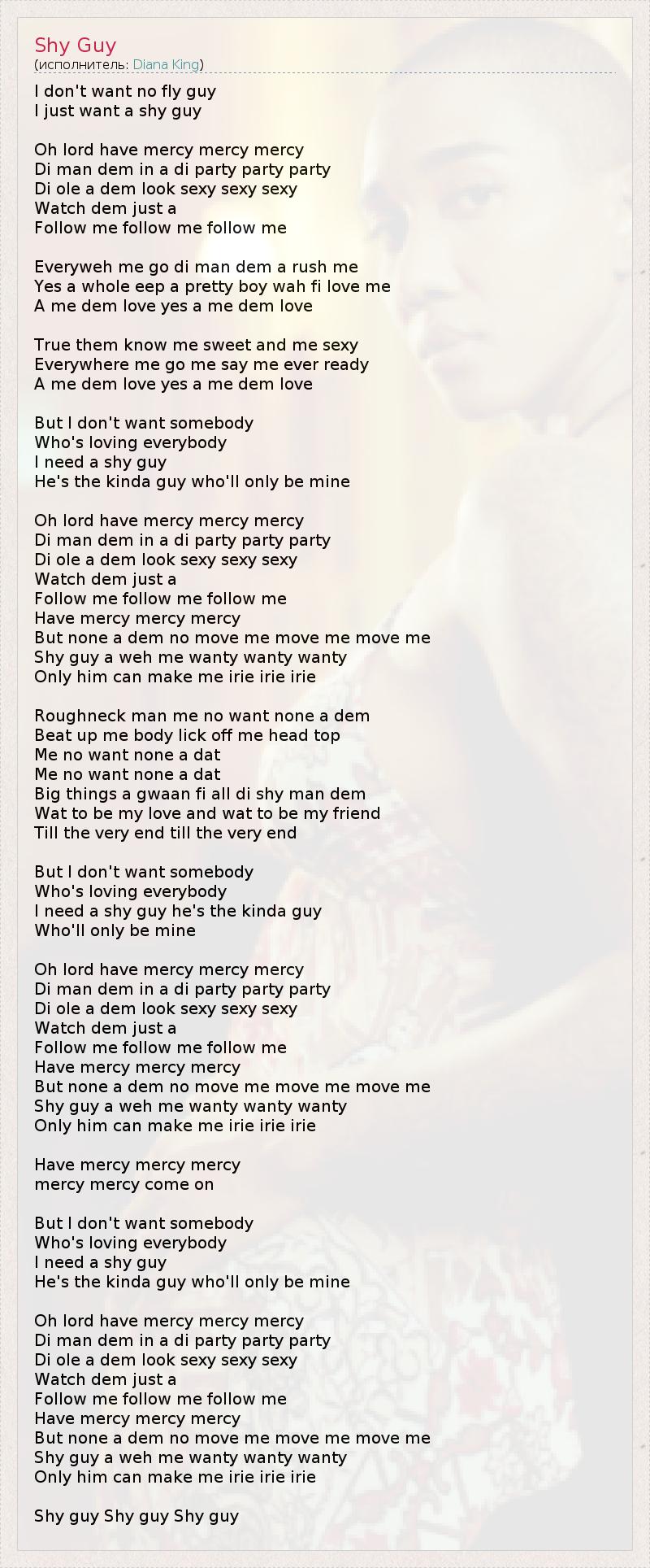 I don't want no fly guy I just want a shy guy Oh lord have mercy mercy mercy Di man dem in a di party party party Di ole a dem look sexy sexy sexy Watch dem just a Follow me follow me follow me Everyweh me go di man dem a rush me Yes a whole eep a pretty boy wah fi love me A me dem love yes a me dem love True them know me sweet and me sexy Everywhere me go me say me ever ready A me dem love yes a me dem love But I don't want somebody Who's loving everybody I need a shy guy He's the kinda guy who'll only be mine Oh lord have mercy mercy mercy Di man dem in a di party party party Di ole a dem look sexy sexy sexy Watch dem just a Follow me follow me follow me Have mercy mercy mercy But none a dem no move me move me move me Shy guy a weh me wanty wanty wanty Only him can make me irie irie irie Roughneck man me no want none a dem Beat up me body lick off me head top Me no want none a dat Me no want none a dat Big things a gwaan fi all di shy man dem Wat to be my love and wat to be my friend Till the very end till the very end But I don't want somebody Who's loving everybody I need a shy guy he's the kinda guy Who'll only be mine Oh lord have mercy mercy mercy Di man dem in a di party party party Di ole a dem look sexy sexy sexy Watch dem just a Follow me follow me follow me Have mercy mercy mercy But none a dem no move me move me move me Shy guy a weh me wanty wanty wanty Only him can make me irie irie irie Have mercy mercy mercy mercy mercy come on But I don't want somebody Who's loving everybody I need a shy guy He's the kinda guy who'll only be mine Oh lord have mercy mercy mercy Di man dem in a di party party party Di ole a dem look sexy sexy sexy Watch dem just a Follow me follow me follow me Have mercy mercy mercy But none a dem no move me move me move me Shy guy a weh me wanty wanty wanty Only him can make me irie irie irie Shy guy Shy guy Shy guy