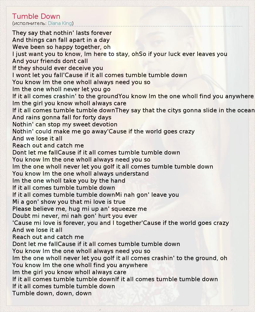 They say that nothin' lasts forever And things can fall apart in a day Weve been so happy together, oh I just want you to know, Im here to stay, ohSo if your luck ever leaves you And your friends dont call If they should ever deceive you I wont let you fall'Cause if it all comes tumble tumble down You know Im the one wholl always need you so Im the one wholl never let you go If it all comes crashin' to the groundYou know Im the one wholl find you anywhere Im the girl you know wholl always care If it all comes tumble tumble downThey say that the citys gonna slide in the ocean And rains gonna fall for forty days Nothin' can stop my sweet devotion Nothin' could make me go away'Cause if the world goes crazy And we lose it all Reach out and catch me Dont let me fallCause if it all comes tumble tumble down You know Im the one wholl always need you so Im the one wholl never let you goIf it all comes tumble tumble down You know Im the one wholl always understand Im the one wholl take you by the hand If it all comes tumble tumble down If it all comes tumble tumble downMi nah gon' leave you Mi a gon' show you that mi love is true Please believe me, hug mi up an' squeeze me Doubt mi never, mi nah gon' hurt you ever 'Cause mi love is forever, you and I together'Cause if the world goes crazy And we lose it all Reach out and catch me Dont let me fallCause if it all comes tumble tumble down You know Im the one wholl always need you so Im the one wholl never let you goIf it all comes crashin' to the ground, oh You know Im the one wholl find you anywhere Im the girl you know wholl always care If it all comes tumble tumble downIf it all comes tumble tumble down If it all comes tumble tumble down Tumble down, down, down