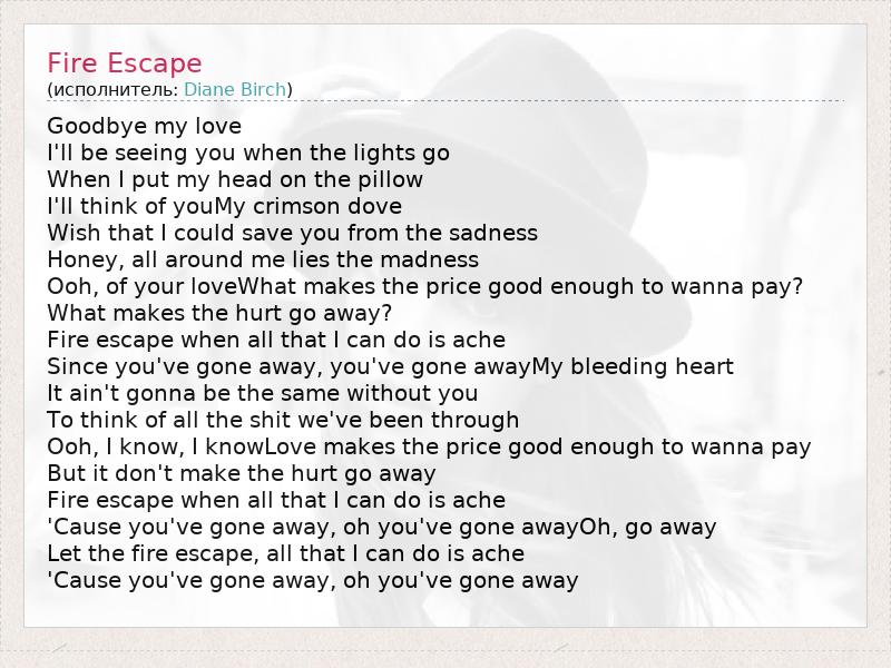 Goodbye my love I'll be seeing you when the lights go When I put my head on the pillow I'll think of youMy crimson dove Wish that I could save you from the sadness Honey, all around me lies the madness Ooh, of your loveWhat makes the price good enough to wanna pay? What makes the hurt go away? Fire escape when all that I can do is ache Since you've gone away, you've gone awayMy bleeding heart It ain't gonna be the same without you To think of all the shit we've been through Ooh, I know, I knowLove makes the price good enough to wanna pay But it don't make the hurt go away Fire escape when all that I can do is ache 'Cause you've gone away, oh you've gone awayOh, go away Let the fire escape, all that I can do is ache 'Cause you've gone away, oh you've gone away