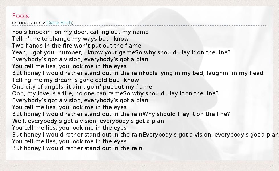 Fools knockin' on my door, calling out my name Tellin' me to change my ways but I know Two hands in the fire won't put out the flame Yeah, I got your number, I know your gameSo why should I lay it on the line? Everybody's got a vision, everybody's got a plan You tell me lies, you look me in the eyes But honey I would rather stand out in the rainFools lying in my bed, laughin' in my head Telling me my dream's gone cold but I know One city of angels, it ain't goin' put out my flame Ooh, my love is a fire, no one can tameSo why should I lay it on the line? Everybody's got a vision, everybody's got a plan You tell me lies, you look me in the eyes But honey I would rather stand out in the rainWhy should I lay it on the line? Well, everybody's got a vision, everybody's got a plan You tell me lies, you look me in the eyes But honey I would rather stand out in the rainEverybody's got a vision, everybody's got a plan You tell me lies, you look me in the eyes But honey I would rather stand out in the rain