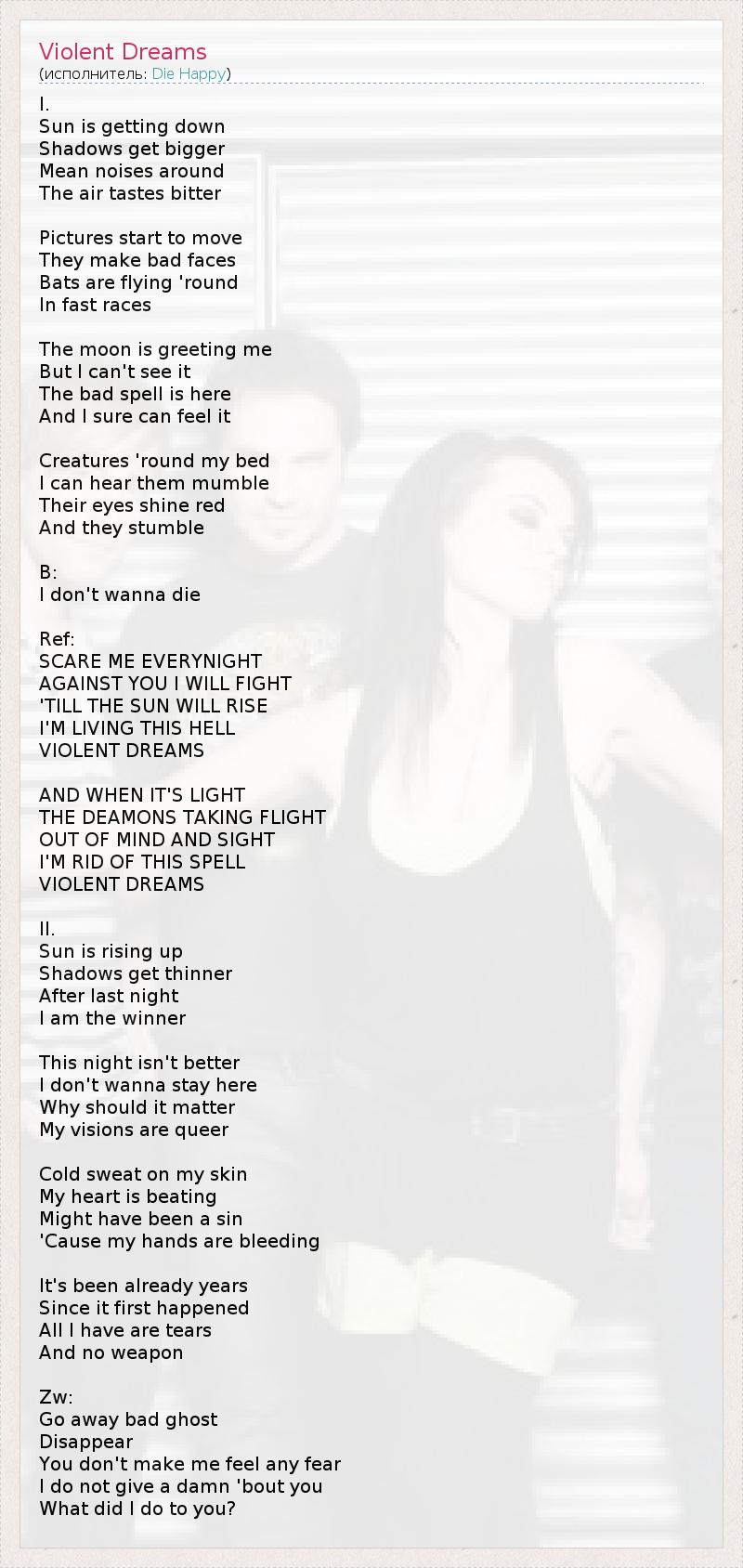 I. Sun is getting down Shadows get bigger Mean noises around The air tastes bitter Pictures start to move They make bad faces Bats are flying 'round In fast races The moon is greeting me But I can't see it The bad spell is here And I sure can feel it Creatures 'round my bed I can hear them mumble Their eyes shine red And they stumble B: I don't wanna die Ref: SCARE ME EVERYNIGHT AGAINST YOU I WILL FIGHT 'TILL THE SUN WILL RISE I'M LIVING THIS HELL VIOLENT DREAMS AND WHEN IT'S LIGHT THE DEAMONS TAKING FLIGHT OUT OF MIND AND SIGHT I'M RID OF THIS SPELL VIOLENT DREAMS II. Sun is rising up Shadows get thinner After last night I am the winner This night isn't better I don't wanna stay here Why should it matter My visions are queer Cold sweat on my skin My heart is beating Might have been a sin 'Cause my hands are bleeding It's been already years Since it first happened All I have are tears And no weapon Zw: Go away bad ghost Disappear You don't make me feel any fear I do not give a damn 'bout you What did I do to you?