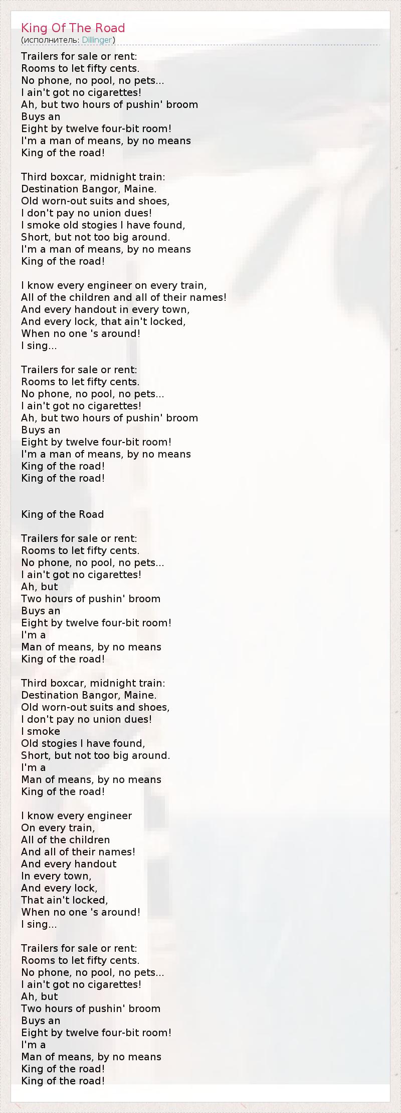 Trailers for sale or rent: Rooms to let fifty cents. No phone, no pool, no pets... I ain't got no cigarettes! Ah, but two hours of pushin' broom Buys an Eight by twelve four-bit room! I'm a man of means, by no means King of the road! Third boxcar, midnight train: Destination Bangor, Maine. Old worn-out suits and shoes, I don't pay no union dues! I smoke old stogies I have found, Short, but not too big around. I'm a man of means, by no means King of the road! I know every engineer on every train, All of the children and all of their names! And every handout in every town, And every lock, that ain't locked, When no one 's around! I sing... Trailers for sale or rent: Rooms to let fifty cents. No phone, no pool, no pets... I ain't got no cigarettes! Ah, but two hours of pushin' broom Buys an Eight by twelve four-bit room! I'm a man of means, by no means King of the road! King of the road! King of the Road Trailers for sale or rent: Rooms to let fifty cents. No phone, no pool, no pets... I ain't got no cigarettes! Ah, but Two hours of pushin' broom Buys an Eight by twelve four-bit room! I'm a Man of means, by no means King of the road! Third boxcar, midnight train: Destination Bangor, Maine. Old worn-out suits and shoes, I don't pay no union dues! I smoke Old stogies I have found, Short, but not too big around. I'm a Man of means, by no means King of the road! I know every engineer On every train, All of the children And all of their names! And every handout In every town, And every lock, That ain't locked, When no one 's around! I sing... Trailers for sale or rent: Rooms to let fifty cents. No phone, no pool, no pets... I ain't got no cigarettes! Ah, but Two hours of pushin' broom Buys an Eight by twelve four-bit room! I'm a Man of means, by no means King of the road! King of the road!