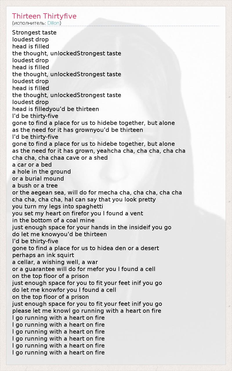 Strongest taste loudest drop head is filled the thought, unlockedStrongest taste loudest drop head is filled the thought, unlockedStrongest taste loudest drop head is filled the thought, unlockedStrongest taste loudest drop head is filledyou'd be thirteen I'd be thirty-five gone to find a place for us to hidebe together, but alone as the need for it has grownyou'd be thirteen I'd be thirty-five gone to find a place for us to hidebe together, but alone as the need for it has grown, yeahcha cha, cha cha, cha cha cha cha, cha chaa cave or a shed a car or a bed a hole in the ground or a burial mound a bush or a tree or the aegean sea, will do for mecha cha, cha cha, cha cha cha cha, cha cha, haI can say that you look pretty you turn my legs into spaghetti you set my heart on firefor you I found a vent in the bottom of a coal mine just enough space for your hands in the insideif you go do let me knowyou'd be thirteen I'd be thirty-five gone to find a place for us to hidea den or a desert perhaps an ink squirt a cellar, a wishing well, a war or a guarantee will do for mefor you I found a cell on the top floor of a prison just enough space for you to fit your feet inif you go do let me knowfor you I found a cell on the top floor of a prison just enough space for you to fit your feet inif you go please let me knowI go running with a heart on fire I go running with a heart on fire I go running with a heart on fire I go running with a heart on fire I go running with a heart on fire I go running with a heart on fire I go running with a heart on fire