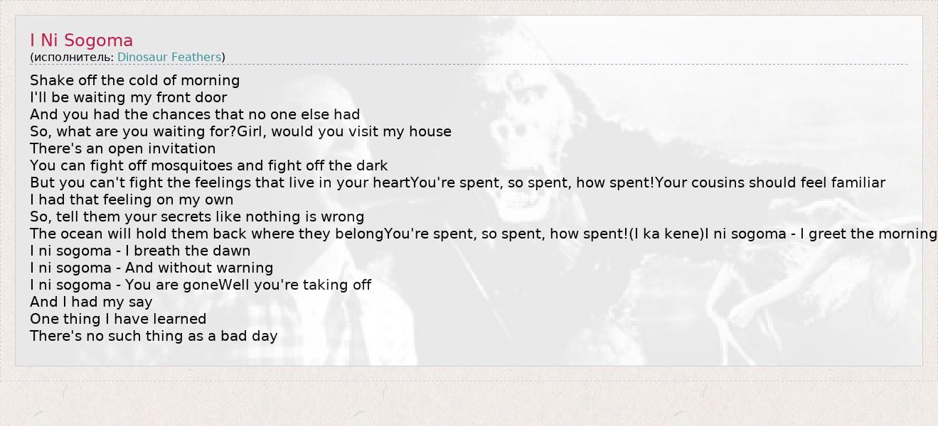 The ocean will hold them back where they belongYou're spent, so spent, how spent!(I ka kene)I ni sogoma - I greet the morning