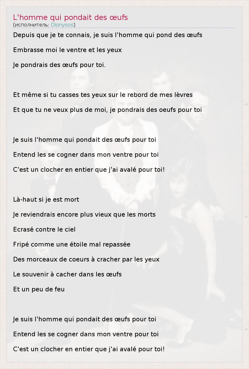 Depuis que je te connais, je suis l'homme qui pond des œufs Embrasse moi le ventre et les yeux Je pondrais des œufs pour toi. Et même si tu casses tes yeux sur le rebord de mes lèvres Et que tu ne veux plus de moi, je pondrais des oeufs pour toi Je suis l'homme qui pondait des œufs pour toi Entend les se cogner dans mon ventre pour toi C'est un clocher en entier que j'ai avalé pour toi! Là-haut si je est mort Je reviendrais encore plus vieux que les morts Ecrasé contre le ciel Fripé comme une étoile mal repassée Des morceaux de coeurs à cracher par les yeux Le souvenir à cacher dans les œufs Et un peu de feu Je suis l'homme qui pondait des œufs pour toi Entend les se cogner dans mon ventre pour toi C'est un clocher en entier que j'ai avalé pour toi!