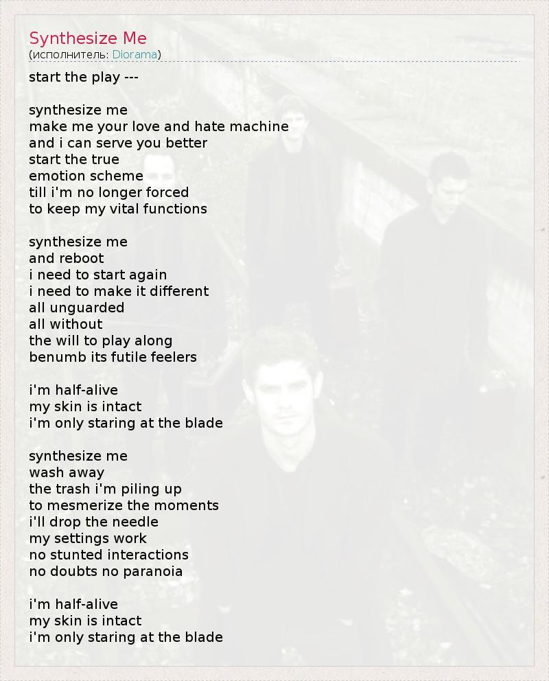 start the play --- synthesize me make me your love and hate machine and i can serve you better start the true emotion scheme till i'm no longer forced to keep my vital functions synthesize me and reboot i need to start again i need to make it different all unguarded all without the will to play along benumb its futile feelers i'm half-alive my skin is intact i'm only staring at the blade synthesize me wash away the trash i'm piling up to mesmerize the moments i'll drop the needle my settings work no stunted interactions no doubts no paranoia i'm half-alive my skin is intact i'm only staring at the blade