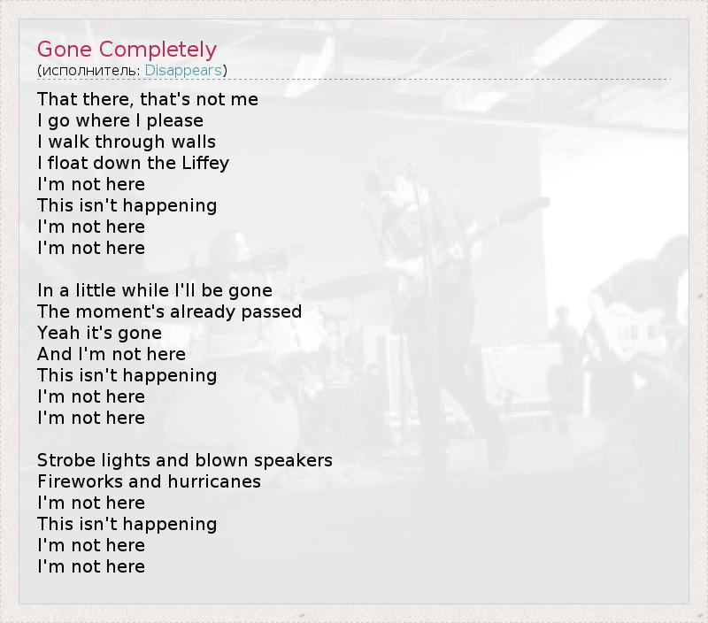 That there, that's not me I go where I please I walk through walls I float down the Liffey I'm not here This isn't happening I'm not here I'm not here In a little while I'll be gone The moment's already passed Yeah it's gone And I'm not here This isn't happening I'm not here I'm not here Strobe lights and blown speakers Fireworks and hurricanes I'm not here This isn't happening I'm not here I'm not here