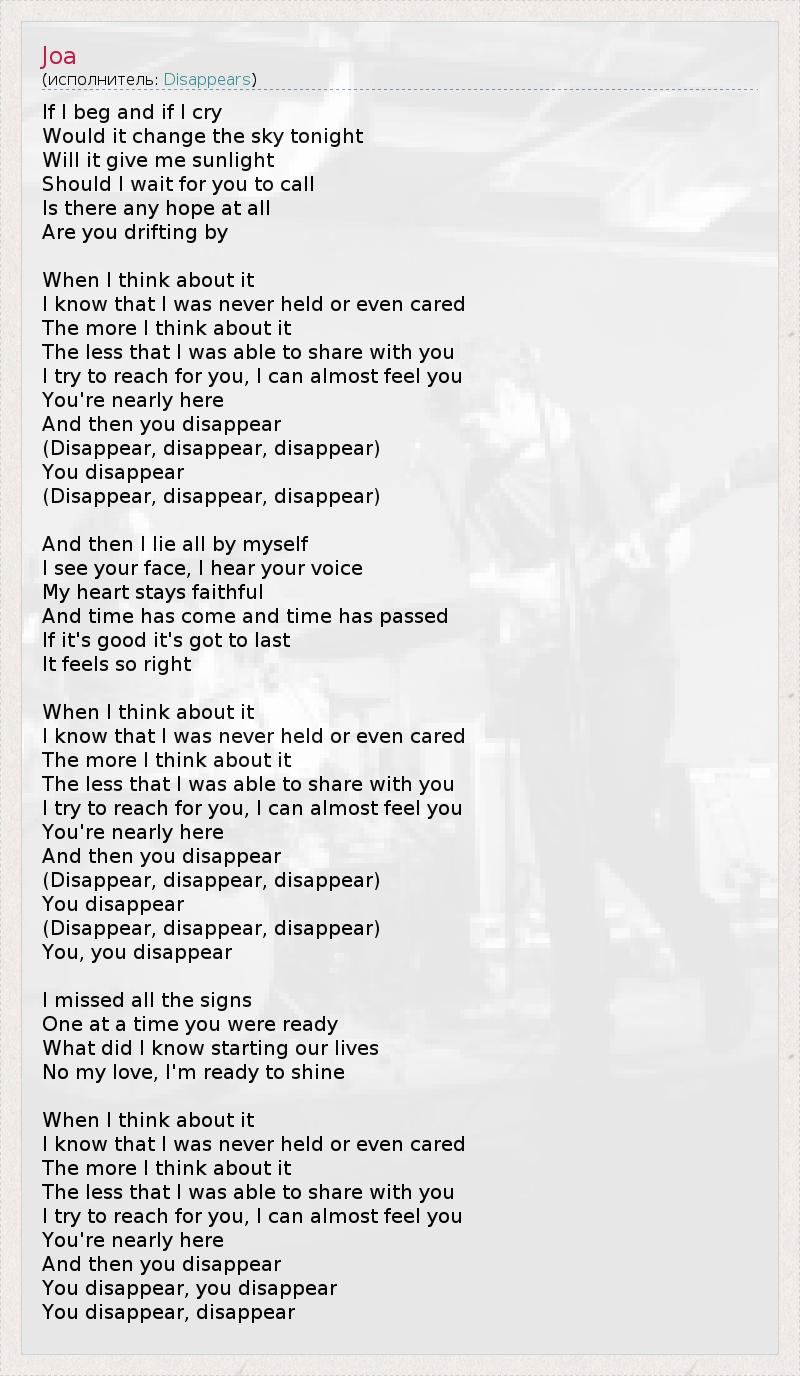 Если я буду умолять и плакать, Изменит ли это небо сегодня вечером, Прольётся ли на меня солнечный свет? Следует ли мне ждать, что ты зайдёшь? Есть ли вообще хоть какая-то надежда? Или ты пройдёшь мимо? Когда я думаю об этом, Я понимаю, что меня никогда не удерживали, не любили... Чем больше я думаю об этом, Тем меньше о том, что я уже разделила с тобой... Я пытаюсь приблизиться к тебе, я почти чувствую тебя, Ты почти рядом, Но вдруг ты исчезаешь... (Исчезаешь, исчезаешь, исчезаешь) Ты исчезаешь... (Исчезаешь, исчезаешь, исчезаешь) Когда я лежу совсем одна, Я вижу твоё лицо, я слышу твой голос, Моё сердце продолжает быть верным тебе, Но моё время пришло и ушло... Если это правильно, чувство должно продолжаться, И моё сердце говорит "да"... Когда я думаю об этом, Я понимаю, что меня никогда не удерживали, не любили... Чем больше я думаю об этом, Тем меньше о том, что я уже разделила с тобой... Я пытаюсь приблизиться к тебе, я почти чувствую тебя, Ты почти рядом, Но вдруг ты исчезаешь... (Исчезаешь, исчезаешь, исчезаешь) Ты исчезаешь... (Исчезаешь, исчезаешь, исчезаешь) Ты исчезаешь Я пропустила все знаки, Один за одним, а ты был готов... Что я знала, только начиная жить? Но теперь я готова сиять, любовь моя. Когда я думаю об этом, Я понимаю, что меня никогда не удерживали, не любили... Чем больше я думаю об этом, Тем меньше о том, что я уже разделила с тобой... Я пытаюсь приблизиться к тебе, я почти чувствую тебя, Ты почти рядом, Но вдруг ты исчезаешь... Ты исчезаешь... Исчезаешь, исчезаешь...
