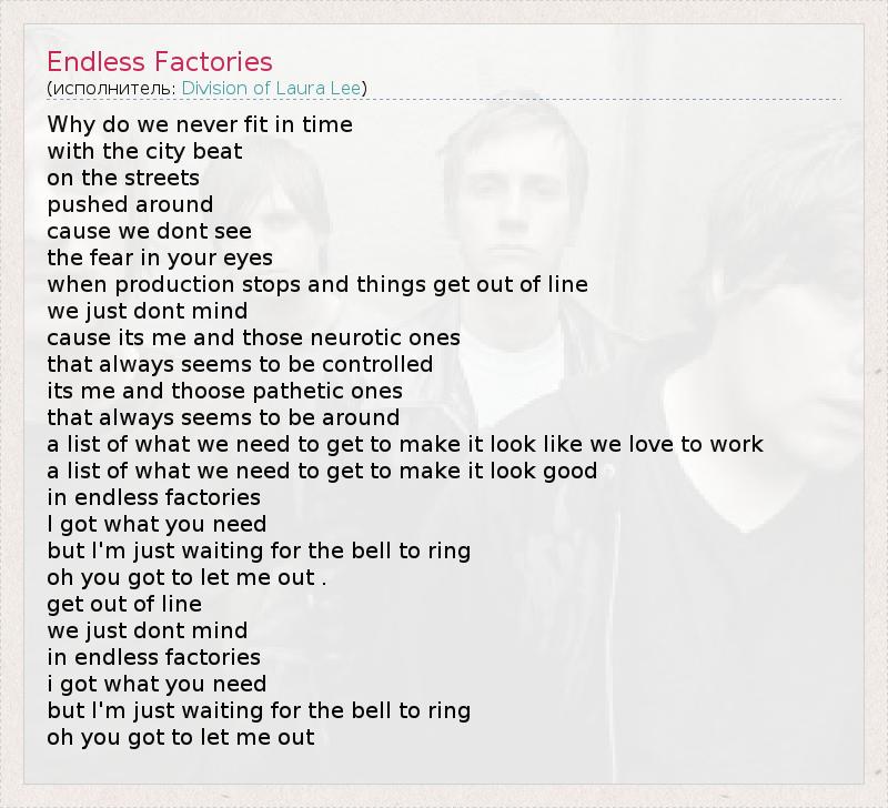 Why do we never fit in time with the city beat on the streets pushed around cause we dont see the fear in your eyes when production stops and things get out of line we just dont mind cause its me and those neurotic ones that always seems to be controlled its me and thoose pathetic ones that always seems to be around a list of what we need to get to make it look like we love to work a list of what we need to get to make it look good in endless factories I got what you need but I'm just waiting for the bell to ring oh you got to let me out . get out of line we just dont mind in endless factories i got what you need but I'm just waiting for the bell to ring oh you got to let me out