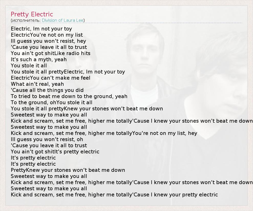 Electric, Im not your toy ElectricYou're not on my list Ill guess you won't resist, hey 'Cause you leave it all to trust You ain't got shitLike radio hits It's such a myth, yeah You stole it all You stole it all prettyElectric, Im not your toy ElectricYou can't make me feel What ain't real, yeah 'Cause all the things you did To tried to beat me down to the ground, yeah To the ground, ohYou stole it all You stole it all prettyKnew your stones won't beat me down Sweetest way to make you all Kick and scream, set me free, higher me totally'Cause I knew your stones won't beat me down Sweetest way to make you all Kick and scream, set me free, higher me totallyYou're not on my list, hey Ill guess you won't resist, oh 'Cause you leave it all to trust You ain't got shitIt's pretty electric It's pretty electric It's pretty electric PrettyKnew your stones won't beat me down Sweetest way to make you all Kick and scream, set me free, higher me totally'Cause I knew your stones won't beat me down Sweetest way to make you all Kick and scream, set me free, higher me totally'Cause I knew your pretty electric