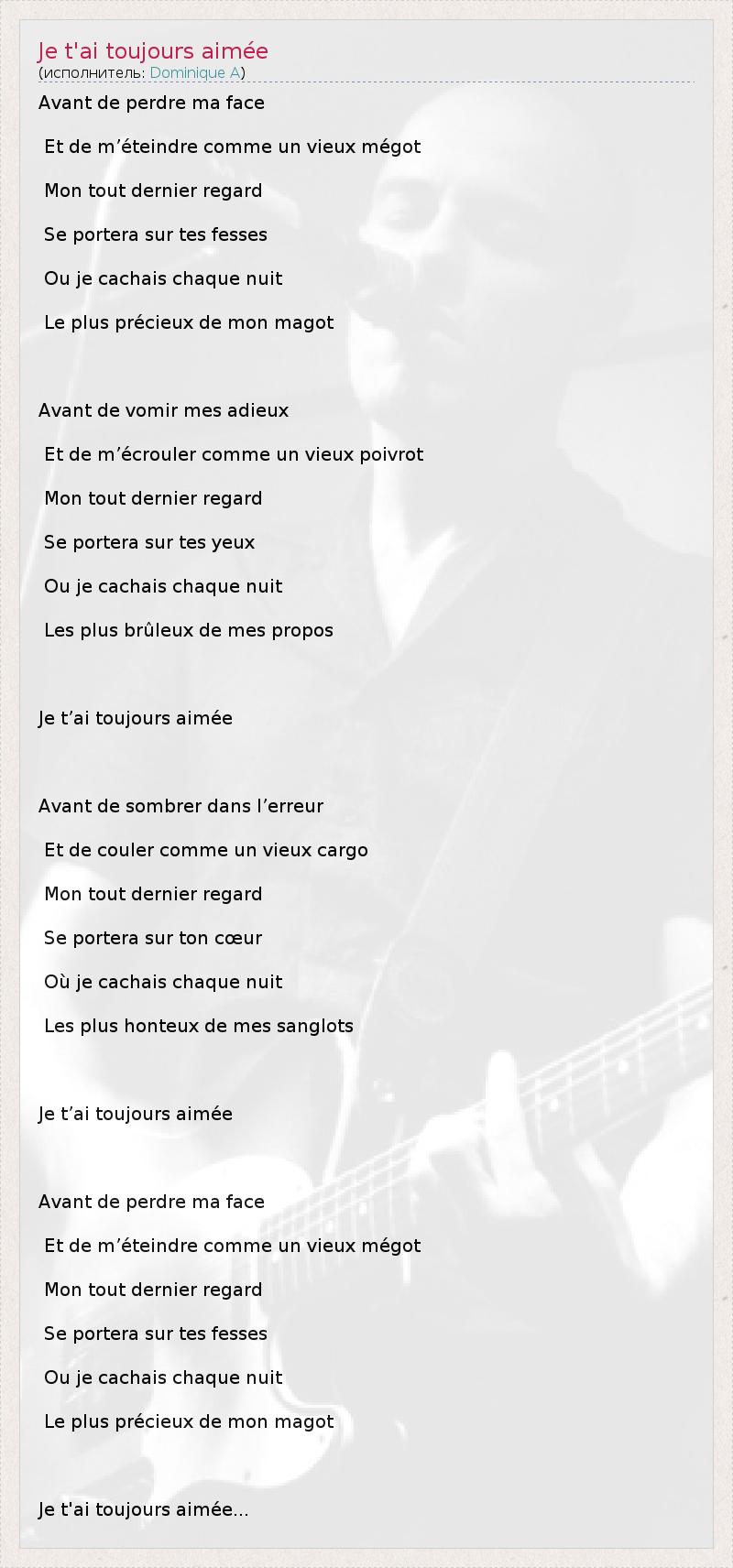 Avant de perdre ma face Et de m’éteindre comme un vieux mégot Mon tout dernier regard Se portera sur tes fesses Ou je cachais chaque nuit Le plus précieux de mon magot Avant de vomir mes adieux Et de m’écrouler comme un vieux poivrot Mon tout dernier regard Se portera sur tes yeux Ou je cachais chaque nuit Les plus brûleux de mes propos Je t’ai toujours aimée Avant de sombrer dans l’erreur Et de couler comme un vieux cargo Mon tout dernier regard Se portera sur ton cœur Où je cachais chaque nuit Les plus honteux de mes sanglots Je t’ai toujours aimée Avant de perdre ma face Et de m’éteindre comme un vieux mégot Mon tout dernier regard Se portera sur tes fesses Ou je cachais chaque nuit Le plus précieux de mon magot Je t'ai toujours aimée...