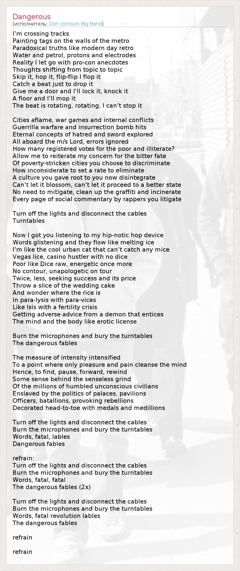 I'm crossing tracks Painting tags on the walls of the metro Paradoxical truths like modern day retro Water and petrol, protons and electrodes Reality I let go with pro-con anecdotes Thoughts shifting from topic to topic Skip it, hop it, flip-flip I flop it Catch a beat just to drop it Give me a door and I'll lock it, knock it A floor and I'll mop it The beat is rotating, rotating, I can't stop it Cities aflame, war games and internal conflicts Guerrilla warfare and insurrection bomb hits Eternal concepts of hatred and sword explored All aboard the m/s Lord, errors ignored How many registered votes for the poor and illiterate? Allow me to reiterate my concern for the bitter fate Of poverty-stricken cities you choose to discriminate How inconsiderate to set a rate to eliminate A culture you gave root to you now disintegrate Can't let it blossom, can't let it proceed to a better state No need to mitigate, clean up the graffiti and incinerate Every page of social commentary by rappers you litigate Turn off the lights and disconnect the cables Turntables Now I got you listening to my hip-notic hop device Words glistening and they flow like melting ice I'm like the cool urban cat that can't catch any mice Vegas lice, casino hustler with no dice Poor like Dice raw, energetic once more No contour, unapologetic on tour Twice, less, seeking success and its price Throw a slice of the wedding cake And wonder where the rice is In para-lysis with para-vices Like Isis with a fertility crisis Getting adverse advice from a demon that entices The mind and the body like erotic license Burn the microphones and bury the turntables The dangerous fables The measure of intensity intensified To a point where only pleasure and pain cleanse the mind Hence, to find, pause, forward, rewind Some sense behind the senseless grind Of the millions of humbled unconscious civilians Enslaved by the politics of palaces, pavilions Officers, batallions, provoking rebellions Decorated head-to-toe with medals and medillions Turn off the lights and disconnect the cables Burn the microphones and bury the turntables Words, fatal, lables Dangerous fables refrain: Turn off the lights and disconnect the cables Burn the microphones and bury the turntables Words, fatal, fatal The dangerous fables (2x) Turn off the lights and disconnect the cables Burn the microphones and bury the turntables Words, fatal revolution lables The dangerous fables refrain refrain