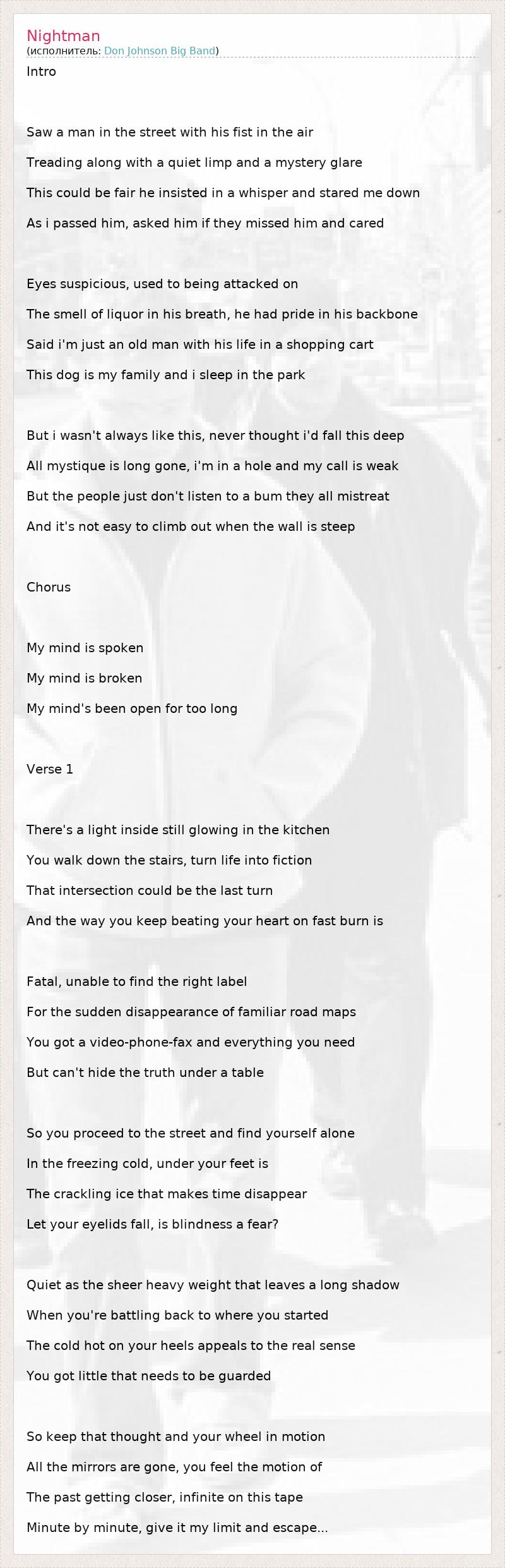 Intro Saw a man in the street with his fist in the air Treading along with a quiet limp and a mystery glare This could be fair he insisted in a whisper and stared me down As i passed him, asked him if they missed him and cared Eyes suspicious, used to being attacked on The smell of liquor in his breath, he had pride in his backbone Said i'm just an old man with his life in a shopping cart This dog is my family and i sleep in the park But i wasn't always like this, never thought i'd fall this deep All mystique is long gone, i'm in a hole and my call is weak But the people just don't listen to a bum they all mistreat And it's not easy to climb out when the wall is steep Chorus My mind is spoken My mind is broken My mind's been open for too long Verse 1 There's a light inside still glowing in the kitchen You walk down the stairs, turn life into fiction That intersection could be the last turn And the way you keep beating your heart on fast burn is Fatal, unable to find the right label For the sudden disappearance of familiar road maps You got a video-phone-fax and everything you need But can't hide the truth under a table So you proceed to the street and find yourself alone In the freezing cold, under your feet is The crackling ice that makes time disappear Let your eyelids fall, is blindness a fear? Quiet as the sheer heavy weight that leaves a long shadow When you're battling back to where you started The cold hot on your heels appeals to the real sense You got little that needs to be guarded So keep that thought and your wheel in motion All the mirrors are gone, you feel the motion of The past getting closer, infinite on this tape Minute by minute, give it my limit and escape...