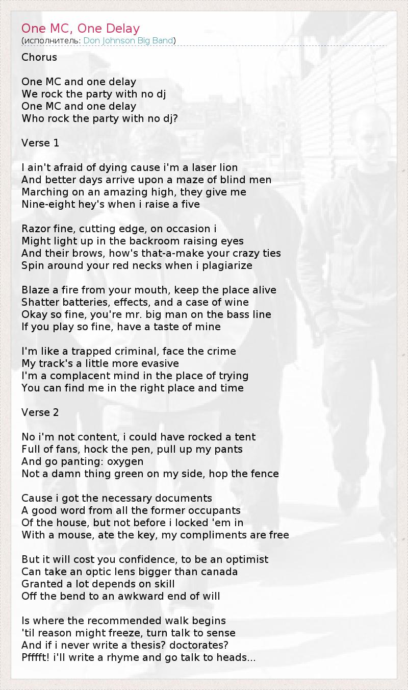 Chorus One MC and one delay We rock the party with no dj One MC and one delay Who rock the party with no dj? Verse 1 I ain't afraid of dying cause i'm a laser lion And better days arrive upon a maze of blind men Marching on an amazing high, they give me Nine-eight hey's when i raise a five Razor fine, cutting edge, on occasion i Might light up in the backroom raising eyes And their brows, how's that-a-make your crazy ties Spin around your red necks when i plagiarize Blaze a fire from your mouth, keep the place alive Shatter batteries, effects, and a case of wine Okay so fine, you're mr. big man on the bass line If you play so fine, have a taste of mine I'm like a trapped criminal, face the crime My track's a little more evasive I'm a complacent mind in the place of trying You can find me in the right place and time Verse 2 No i'm not content, i could have rocked a tent Full of fans, hock the pen, pull up my pants And go panting: oxygen Not a damn thing green on my side, hop the fence Cause i got the necessary documents A good word from all the former occupants Of the house, but not before i locked 'em in With a mouse, ate the key, my compliments are free But it will cost you confidence, to be an optimist Can take an optic lens bigger than canada Granted a lot depends on skill Off the bend to an awkward end of will Is where the recommended walk begins 'til reason might freeze, turn talk to sense And if i never write a thesis? doctorates? Pfffft! i'll write a rhyme and go talk to heads...