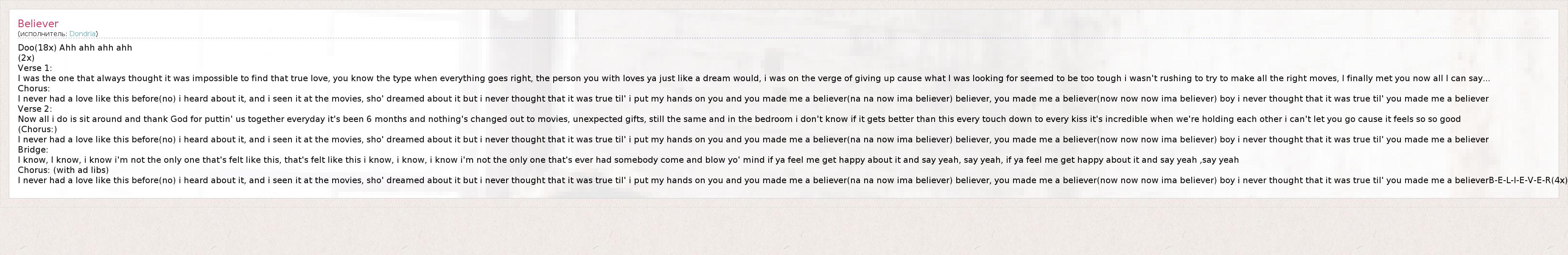 Doo(18x) Ahh ahh ahh ahh (2x) Verse 1: I was the one that always thought it was impossible to find that true love, you know the type when everything goes right, the person you with loves ya just like a dream would, i was on the verge of giving up cause what I was looking for seemed to be too tough i wasn't rushing to try to make all the right moves, I finally met you now all I can say... Chorus: I never had a love like this before(no) i heard about it, and i seen it at the movies, sho' dreamed about it but i never thought that it was true til' i put my hands on you and you made me a believer(na na now ima believer) believer, you made me a believer(now now now ima believer) boy i never thought that it was true til' you made me a believer Verse 2: Now all i do is sit around and thank God for puttin' us together everyday it's been 6 months and nothing's changed out to movies, unexpected gifts, still the same and in the bedroom i don't know if it gets better than this every touch down to every kiss it's incredible when we're holding each other i can't let you go cause it feels so so good (Chorus:) I never had a love like this before(no) i heard about it, and i seen it at the movies, sho' dreamed about it but i never thought that it was true til' i put my hands on you and you made me a believer(na na now ima believer) believer, you made me a believer(now now now ima believer) boy i never thought that it was true til' you made me a believer Bridge: I know, I know, i know i'm not the only one that's felt like this, that's felt like this i know, i know, i know i'm not the only one that's ever had somebody come and blow yo' mind if ya feel me get happy about it and say yeah, say yeah, if ya feel me get happy about it and say yeah ,say yeah Chorus: (with ad libs) I never had a love like this before(no) i heard about it, and i seen it at the movies, sho' dreamed about it but i never thought that it was true til' i put my hands on you and you made me a believer(na na now ima believer) believer, you made me a believer(now now now ima believer) boy i never thought that it was true til' you made me a believerB-E-L-I-E-V-E-R(4x)