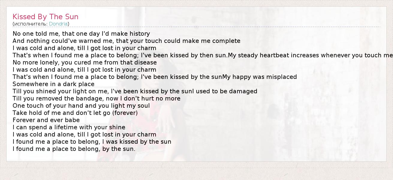 No one told me, that one day I'd make history And nothing could've warned me, that your touch could make me complete I was cold and alone, till I got lost in your charm That's when I found me a place to belong; I've been kissed by then sun.My steady heartbeat increases whenever you touch me No more lonely, you cured me from that disease I was cold and alone, till I got lost in your charm That's when I found me a place to belong; I've been kissed by the sunMy happy was misplaced Somewhere in a dark place Till you shined your light on me, I've been kissed by the sunI used to be damaged Till you removed the bandage, now I don't hurt no more One touch of your hand and you light my soul Take hold of me and don't let go (forever) Forever and ever babe I can spend a lifetime with your shine I was cold and alone, till I got lost in your charm I found me a place to belong, I was kissed by the sun I found me a place to belong, by the sun.